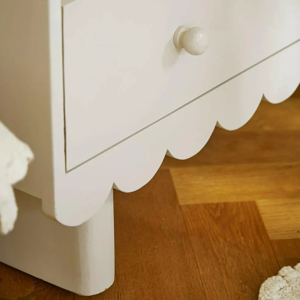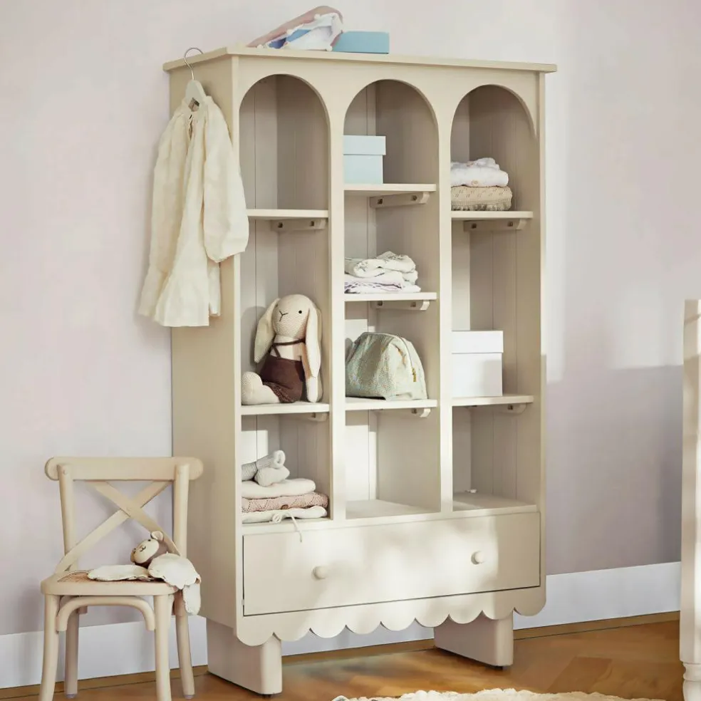 Der Schrank aus Mangoholz vereint auf wunderbare Weise verspieltes Design mit praktischer Funktionalität. Die sanft geschwungenen Bögen und der zarte Farbton in Antikgrau machen ihn zu einem liebevollen Begleiter für jedes Kinderzimmer. Offene Fächer in verschiedenen Größen schaffen einen perfekten Ort für Bücher, Kuscheltiere oder kleine Schätze, während die geräumige Schublade zusätzlichen Stauraum bietet. Das hochwertige Mangoholz sorgt für eine natürliche Ausstrahlung und harmoniert mit der liebevoll gestalteten Wellenkante im Sockelbereich. Ob für Ordnung oder als dekorativer Mittelpunkt – dieses Möbelstück zaubert ein Lächeln in jeden Raum.