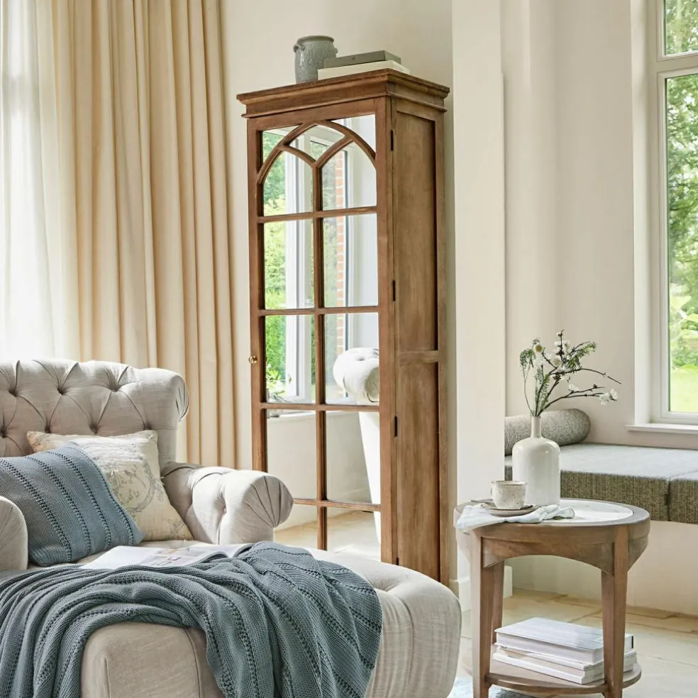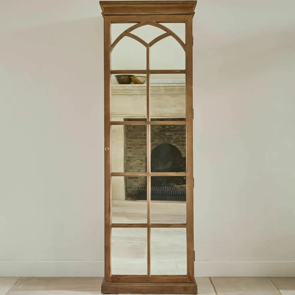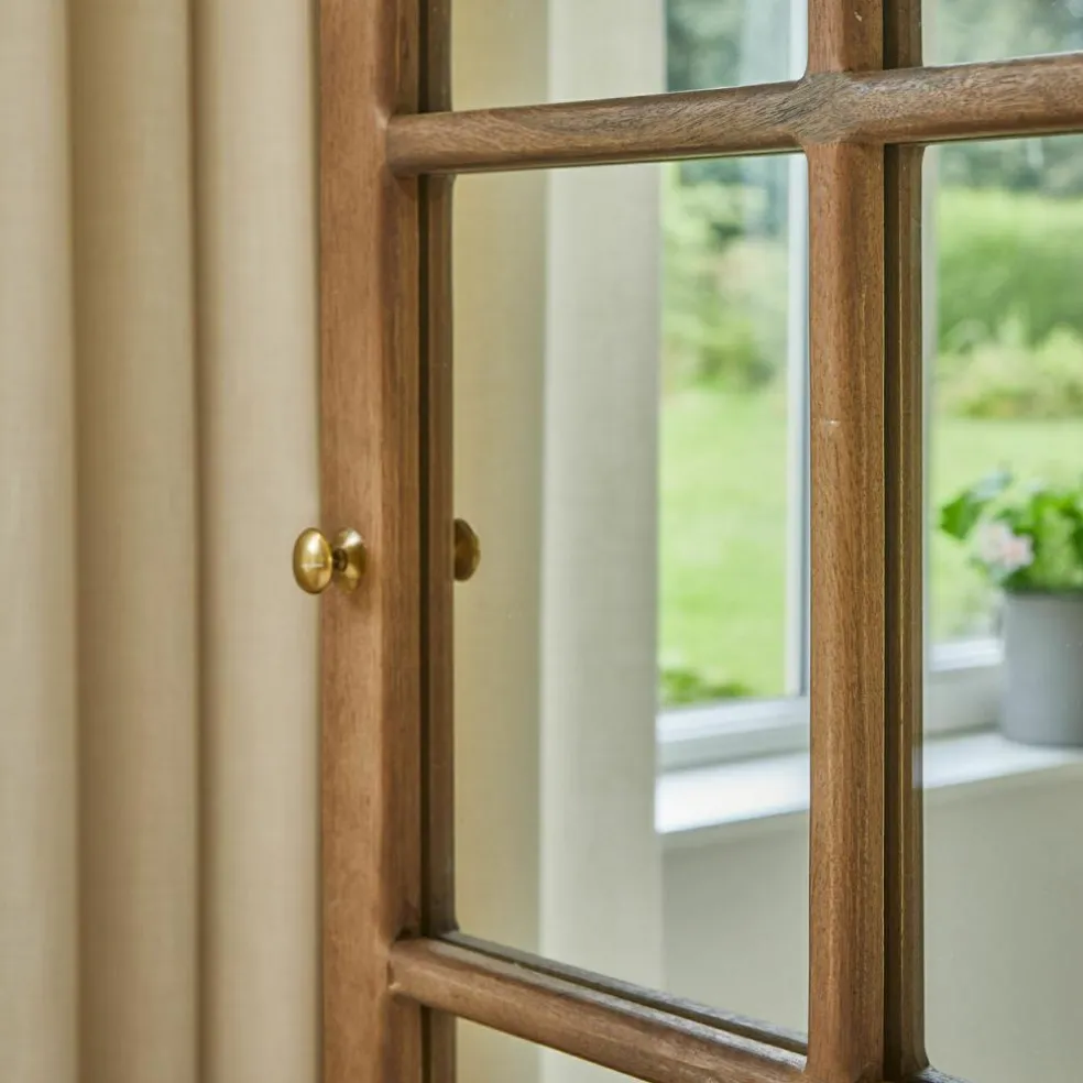 Tauchen Sie ein in die Welt des rustikalen Charmes mit diesem exquisiten Spiegelschrank aus naturbelassenem Mangoholz. Der Schrank besticht durch seine einzigartige Kombination aus natürlichem Holz und einem antikgrauen Innenfinish, das einen faszinierenden Farbkontrast bildet. Die Spiegeltür ist mit einem dekorativen Fensterkreuzmuster versehen, das nicht nur ästhetisch ansprechend ist, sondern auch für eine hellere und offenere Raumwirkung sorgt. Im Inneren bietet der Schrank praktische Regalböden, die reichlich Platz für Ihre persönlichen Gegenstände bieten. Die Rückwand in Latten-Optik verleiht dem Inneren des Schranks zusätzlichen Stil und Charakter. Ob im Wohnzimmer, Schlafzimmer oder Flur – dieser Spiegelschrank ist ein funktionales und dekoratives Highlight, das jeden Raum bereichert.