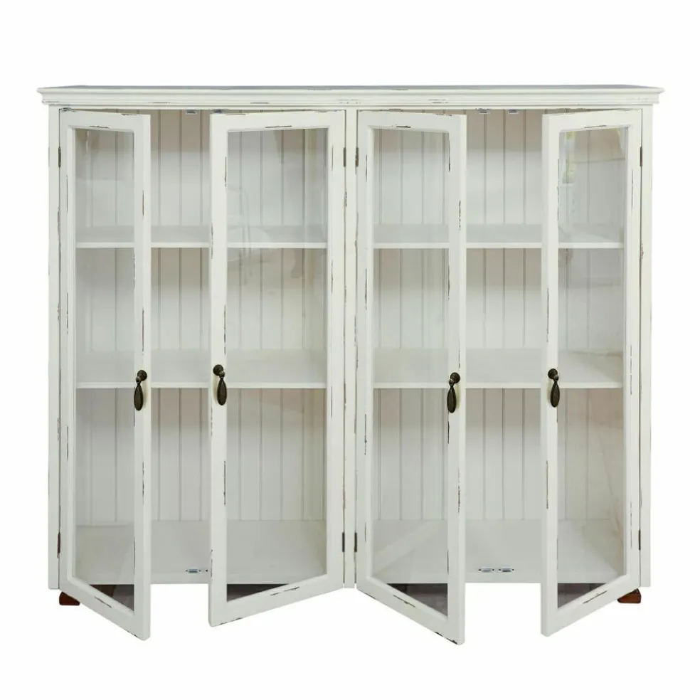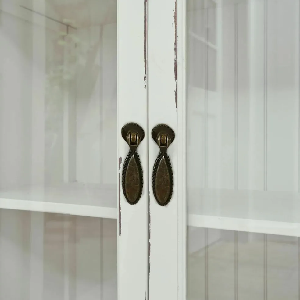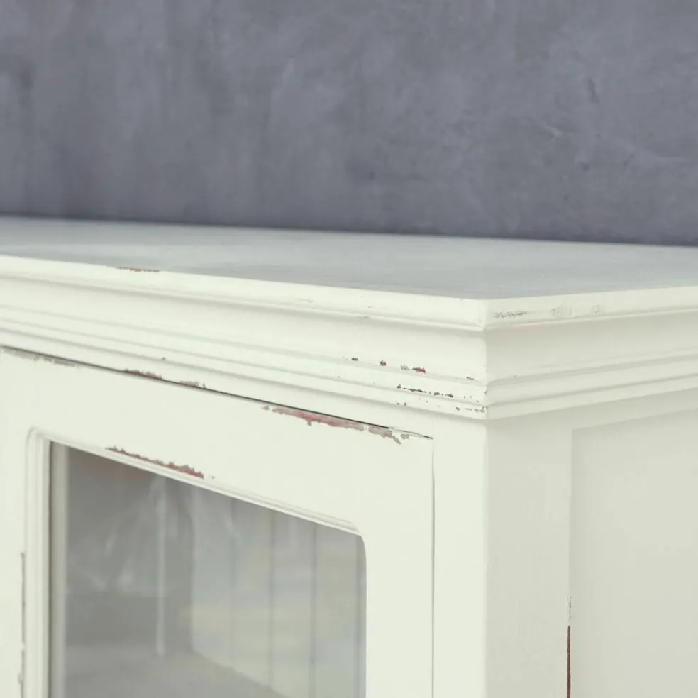 Der großzügige Vitrinenschrank im zeitlosen Landhausstil bringt den Charme vergangener Zeiten in Ihr Zuhause. Das Antik-Finish verleiht ihm eine rustikale Note, die durch die großen Glastüren harmonisch abgerundet wird. Hinter diesen lassen sich nicht nur Geschirr oder Bücher, sondern auch dekorative Accessoires eindrucksvoll präsentieren. Die leicht abgeschliffenen Kanten und die feinen Details wie die nostalgisch inspirierten Metallverschlüsse betonen den Vintage-Look und machen den Schrank zu einem echten Highlight. Die robuste Konstruktion sorgt für Stabilität und Langlebigkeit, während die schlicht gehaltene Farbgebung ihn in verschiedene Einrichtungsstile integrieren lässt. Ein Möbelstück, das Funktionalität mit dekorativem Flair vereint.