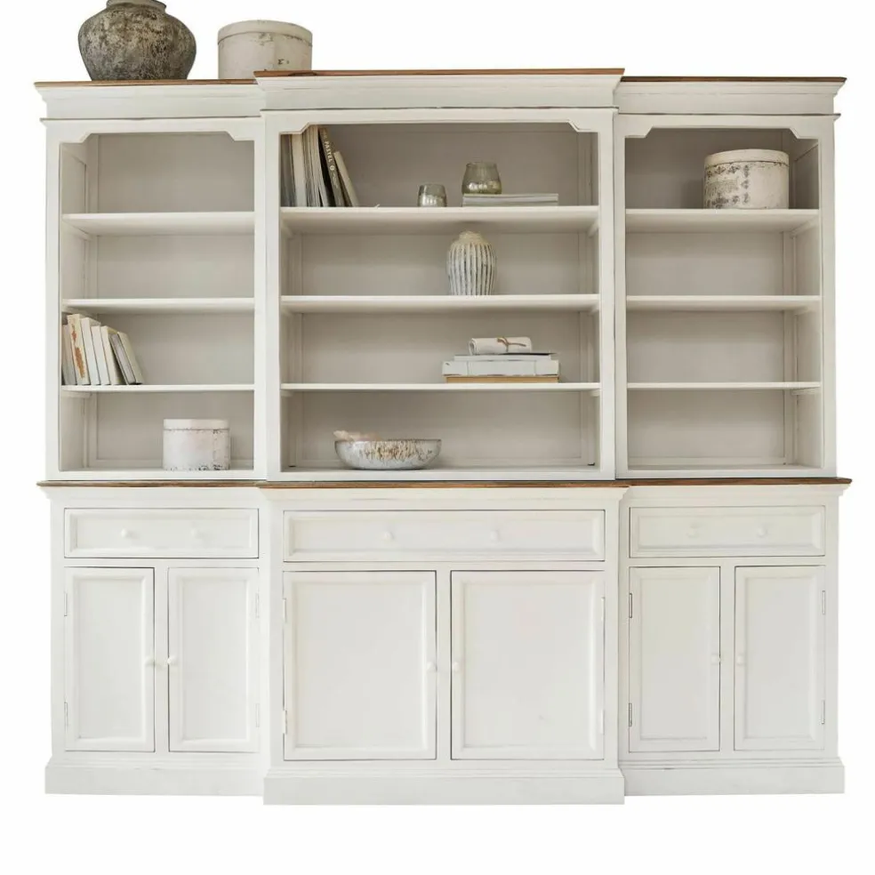Dieser Schrank ist ein wahres Meisterstück des Landhausstils und verbindet Funktionalität mit ästhetischem Anspruch. Das Mangoholz mit Antik-Finish verleiht jedem Raum eine natürliche Wärme und macht das Möbelstück zu einem zeitlosen Blickfang. Besonders hervorzuheben ist die mittige Zierleiste aus naturbelassenem Holz, die das Design harmonisch abrundet. Der großzügige Aufbau mit offenen Regalen und praktischen Schränken sorgt für optimalen Stauraum – sei es für edles Porzellan, inspirierende Literatur oder Ihre liebste Dekoration. Die dezenten Holzknöpfe fügen sich perfekt in das Gesamtbild ein und unterstreichen die Authentizität dieses vielseitigen Möbelstücks.