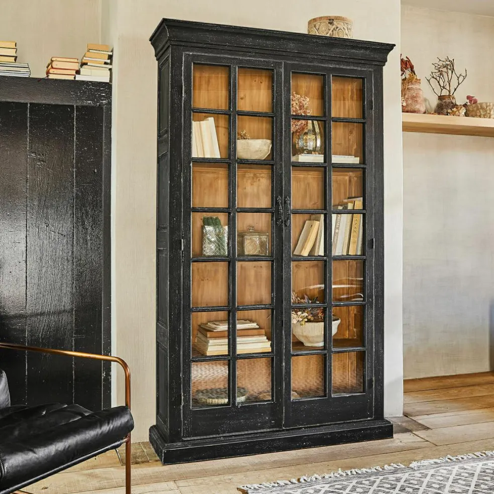 Dieser prächtige Schrank aus Kiefernholz, veredelt mit einem antikschwarzen Finish, ist das Herzstück jeder Raumgestaltung. Die natürlichen Tannenholzeinlegeböden stehen im charmanten Kontrast zum dunklen Rahmen und bieten einen warmen Hintergrund für Bücher, Sammlerstücke oder dekorative Akzente. Mit seinen klaren Linien und den großzügigen Glasfronten, die einen unverstellten Blick auf seine Inhalte gewähren, verbindet dieser Schrank klassische Eleganz mit funktionaler Großzügigkeit. Ein Möbelstück, das nicht nur Stauraum bietet, sondern auch mit seinem reichen Charakter und seiner zeitlosen Ästhetik überzeugt.