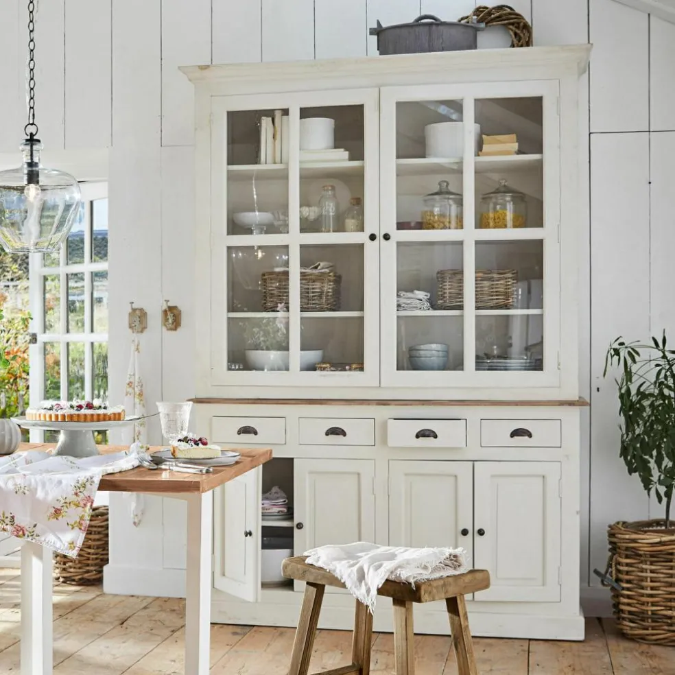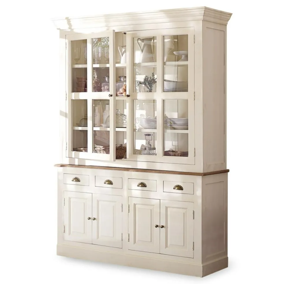 Dieser geschmackvolle und hochwertige Schrank im klassischen Long Island-Stil ist ein Traum! Er macht sich hervorragend im Esszimmer, wirkt aber selbst im Salon oder Wohnzimmer nie deplatziert. Material und Verarbeitung genügen höchsten Ansprüchen und auch das Design ist über jeden Zweifel erhaben. Das dunkle Holz im Mittelteil stellt einen wunderbaren Kontrast zum hellen Grundton dar. Hinter sechs Türen und vier Schubladen bietet das funktionelle Massivholzmöbel außerdem sehr viel Platz für Ihre sieben Sachen.