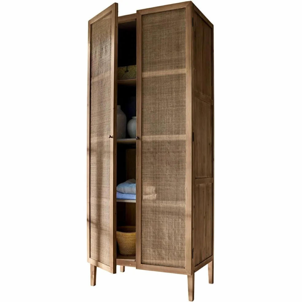 Edler Stil trifft Nachhaltigkeit: Ob im Wohnraum für Decken und Bastelmaterialien oder im Arbeitszimmer für Bücher und Papiere – wie Ihre Entscheidung auch ausfällt, Ihre Lieblingsstücke sind in diesem kunstvoll gefertigten Schrank ordentlich verstaut. Dieses schöne Möbelstück ist aus massivem, wiederaufbereitetem Tannenholz, das sich in seiner natürlichen, nachhaltigen Schönheit zeigt. Die Türen aus Rattengeflecht verstärken den Eindruck und lassen erahnende Einblicke ins Innere zu. Hinter ihnen ist alles gut vor Staub geschützt und doch immer zur Hand, wenn es benötigt wird – ob Haushaltsgeräte, Geschirr, Bücher oder Accessoires aller Art.