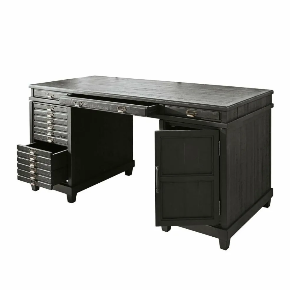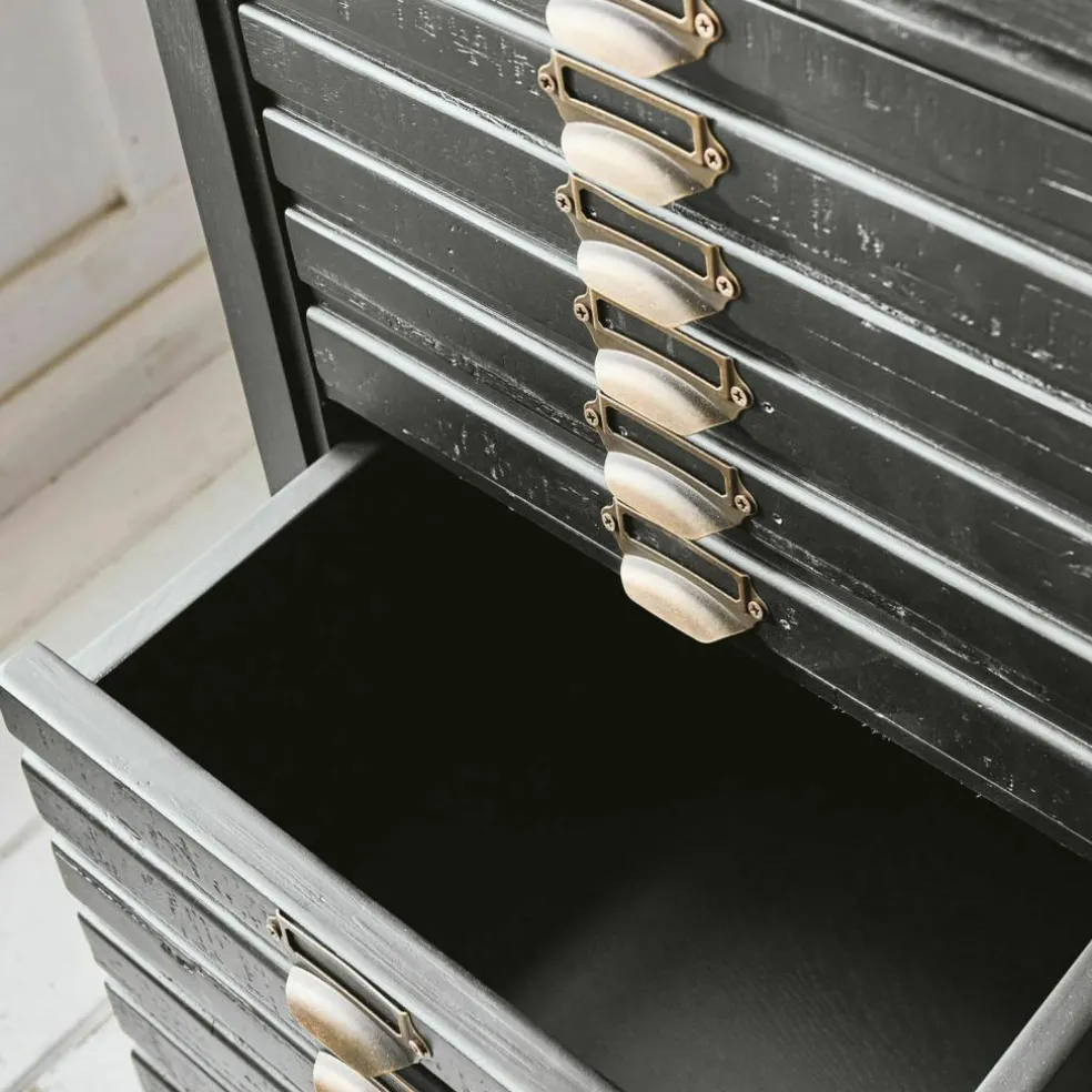 Dieser imposante, großzügige und stabile Schreibtisch bringt puren Nostalgie-Luxus in Ihr Zuhause. Er ist sehr geräumig und besteht aus wertvollem, wiederaufbereitetem Tannenholz mit schöner Maserung und einer Lackierung, welche die natürliche Maserung hübsch durchscheinen lässt. Die edle, goldene Hardware gibt diesem stilvollen Design den letzten Schlif. In den dafür vorgesehenen Fächern lassen sich beschriftete Schildchen einstecken. Dieses Schmuckstück ist einfach perfekt für Ihr Home Office, denn in Sachen Platz ist einiges zu bieten: Auf der linken Seite verbergen sich hinter der Optik vieler kleiner Schubladen in Wirklichkeit zwei große Schubladen. Auf der rechten Seite bietet ein großes Fach viel Platz hinter einer hübschen Tür. Und die obligatorischen kleinen Schubladen für Stifter & Co dürfen direkt unter der Tischplatte natürlich auch nicht fehlen. So ist alles verstaut und sortiert, von Dokumenten bis Schreibutensilien, sodass die Arbeitsfläche immer hübsch frei bleibt für Laptop und anderes. Hiermit kommt wirklich ein klassisches Stück fürs Leben in Ihr Zuhause, an dem Sie lange Freude haben werden. So arbeitet man doch richtig gerne. Und wer möchte, findet bei uns auch die ideal passende Schubladenkommode (23139).