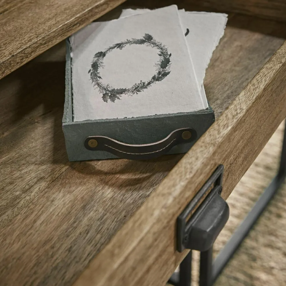 Dieser Schreibtisch könnte gut aus dem Atelier eines Bauhaus-Architekten stammen, der an diesem Möbel seine berühmten Entwürfe zeichnete. Denn dieser Schreibtisch hat alles, was man heutzutage von einem modernen Büromöbel erwartet, nicht mehr und nicht weniger. Er wurde als praktische Eck-Lösung konstruiert, die maximalen Platz zum Arbeiten bietet bei einem minimalen Platzbedarf im Raum. Auf die eine der massiven Platten kommt der Laptop, auf der anderen liegen ein paar Papiere für schnelle Notizen und das Telefon – mehr braucht es in einem modernen, nahezu papierlosen Büro nicht. Und in den beiden geräumigen Schubladen kann alles Übrige verstaut werden, was Sie am Schreibtisch griffbereit haben möchten: Schere, Stifte, Notizzettel, Ladekabel usw. Und wie für klassisches Bauhaus-Design üblich, wird auch bei diesem Schreibtisch die durchdachte Funktionalität mit einem minimalistischen Design verbunden. Zu dem schlanken, geradlinigen Gestell aus schwarzem Eisen wurde edles Mangoholz kombiniert, das sich im warmen Naturton und mit einer besonders lebendigen Maserung präsentiert. Die Griffe an den Schubladen wirken wie eine Reminiszenz an die Aktenschränke aus der Gründerzeit und sorgen für den individuellen Touch.