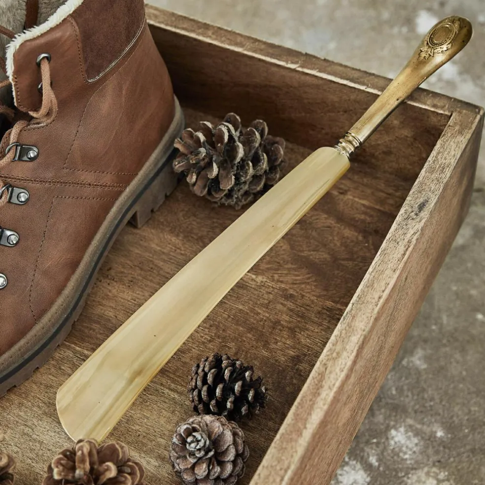 Dieser Schuhlöffel ist Dekoration und Anziehhilfe in Einem. Gefertigt aus natürlich gemasertem Horn und einem vornehm gestalteten Metallgriff der gut in der Hand liegt, macht er schon im Eingangsbereich Ihre Zuhauses auf jeden Gast so richtig Eindruck. Das Highlight: Das Maserung des Horns ist niemals dieselbe – so ist garantiert jedes Stück ein echtes Unikat. Der Antik-Look lässt den Schuhlöffel überdies wirken wie ein Erbstück oder ein Schmuckstück vom Antiquitätenhändler.