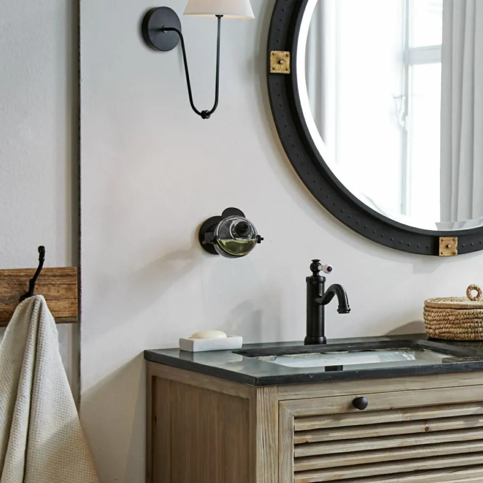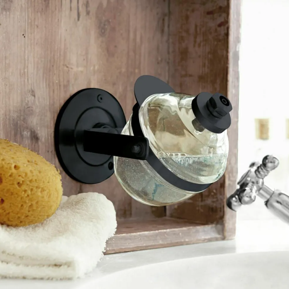 Dieser stilvolle Seifenspender zur Wandbefestigung ist ein Kunstwerk für Ihr Bad oder WC. Die schwenkbare Messinghalterung und der darin liegende, ovale Glasbehälter schaffen Platz am Waschbeckenrand – darüber hinaus sieht die Konstruktion im Retro-Look einfach gut aus. Das Behältnis hat ein Fassungsvermögen von etwa 400 ml. Der Dosierspender lässt sich abschrauben um so die Flüssigseife einfüllen zu können. Leicht zweckentfremdet ist der Seifenspender auch in der Dusche einsetzbar – als Behältnis für Shampoo oder Duschgel. Auch eine Idee: Als Spülmittelspender in der Küche. Um Korrosion zu vermeiden und die Lebensdauer des Seifenspenders zu verlängern, verwenden Sie bitte nur chloridfreie und pH-neutrale Flüssigseifen.
