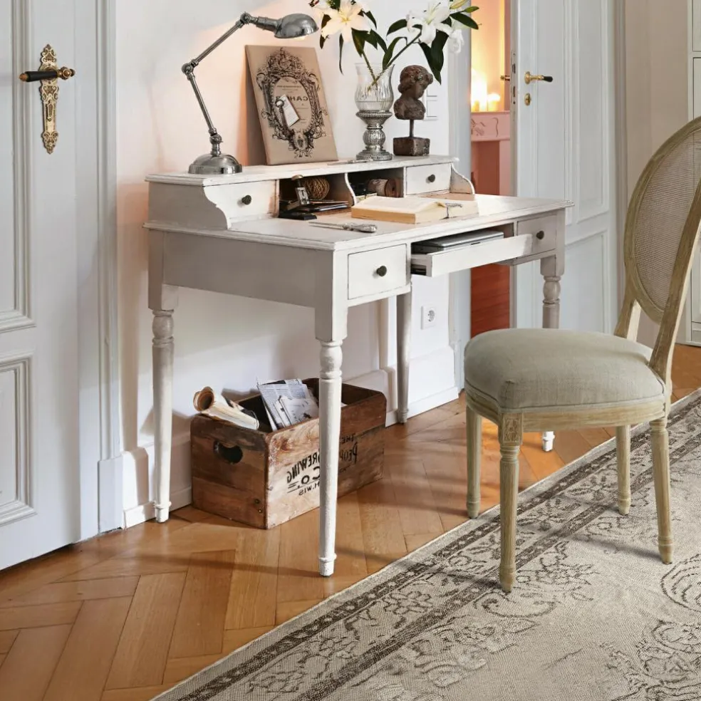 Dieser Sekretär wurde aus Naturholz gefertigt und in einem aufwendigen Verfahren mit Antik-Finish veredelt. Jeder Zentimeter seiner Oberfläche hat Charakter. Bei all der Schönheit, darf man den funktionellen Aspekt natürlich nicht vergessen. Neben der Schreiboberfläche stehen Ihnen vier Schubladen und zwei Ablagefächer zur Verfügung. Ganz oben befindet sich eine schmale Ablage und unter der Tischplatte ist ein Holzfaserbrett versteckt. Dieses lässt sich ganz bequem ein- und ausfahren – beispielsweise um eine Computertastatur darauf abzulegen.