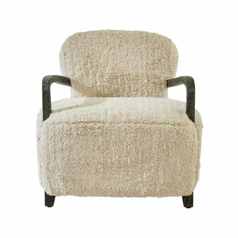 Dieser Sessel ist eine Hommage an gemütliche Stunden – charmant, weich und formschön. Der voluminöse Bezug in Teddyfell-Optik erinnert an flauschige Winterdecken und verleiht dem Sessel eine einladende Wärme. Seine Form ist bewusst kompakt gehalten: rundlich, fast skulptural, mit einer betonten Rückenlehne, die Geborgenheit ausstrahlt. Die Armlehnen aus massivem Mangoholz setzen nicht nur einen optischen Akzent, sondern bringen durch ihre dunkle Lasur und sichtbare Holzstruktur auch eine rauchige Tiefe ins Spiel. So entsteht ein spannender Materialmix – soft trifft charaktervoll – der sowohl in moderne als auch in rustikale Wohnkonzepte passt.