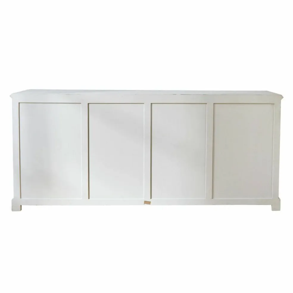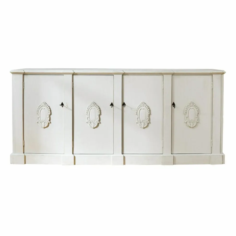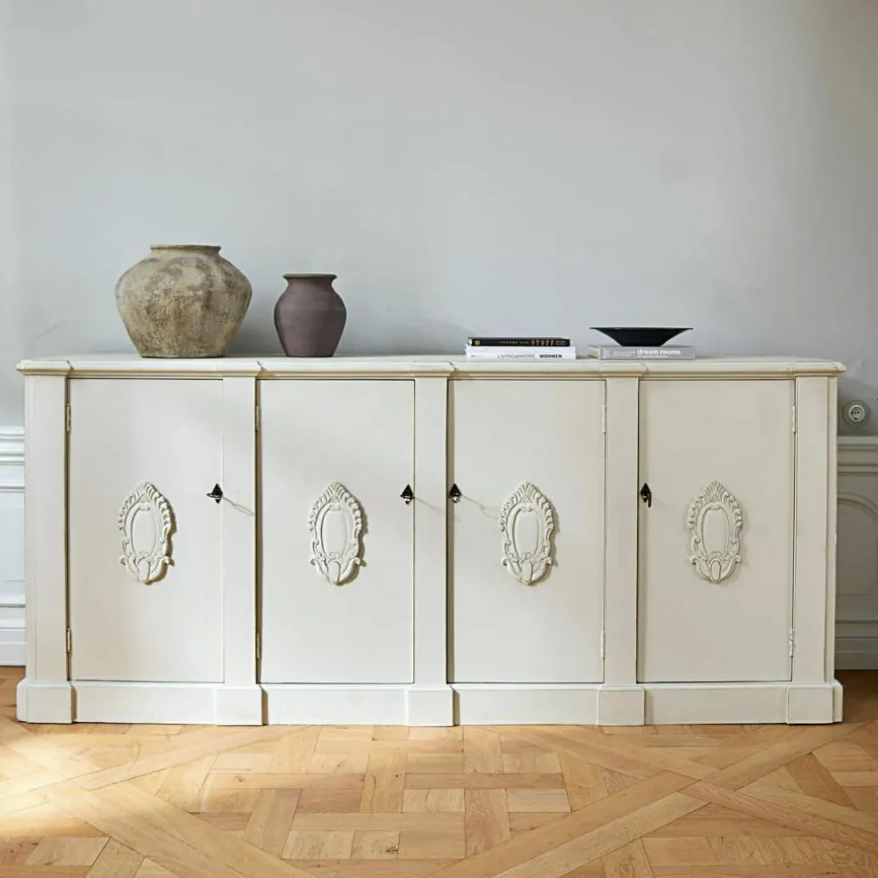 Dieses luxuriöse und großzügige Sideboard mit vielen kunstvollen Details ist ein echtes Prachtstück im nostalgischen Stil. Es besteht aus wertvollem Mangoholz und ist mit prächtigen Ornamenten und reizvollen Griffen im Stil alter Schlüssel verziert. Dieses attraktive Design ist in Handarbeit gefertigt. Dank der acht Innenfächer mit Einlegeböden bietet es viel Stauraum und sorgt so leicht für Ordnung. Ob Papiere, Geschirr oder Wäsche, hier findet vieles Platz. Obenauf lassen sich zudem charmante Dekorationen zaubern. Dieses elegante und romantische Design adelt wirklich jeden Raum, ob Küche oder Wohnzimmer, und passt perfekt zu einem Ambiente im Shabby-Chic.