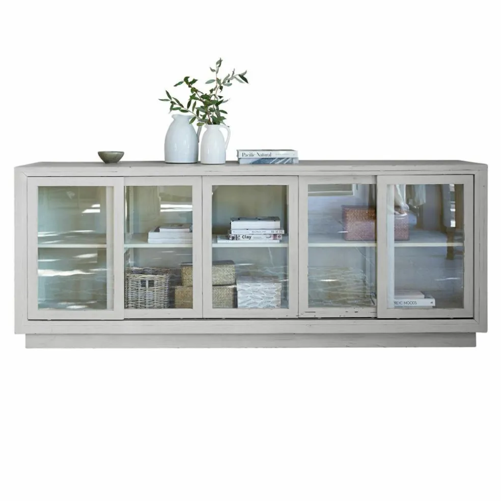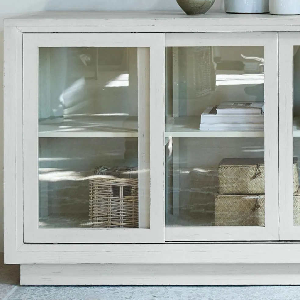 In einer traditionellen Schreinerwerkstatt entstehen Möbelstücke, die Sie viele Jahre begleiten. Denn hochwertige Materialien und beste Handwerksqualität sind Garanten für ein langes Leben. Und weil ein Sideboard ja kein reines Deko-Objekt ist, sondern Sie in seinem Inneren viele Dinge unterbringen möchten, muss so ein Möbelstück auch über beste Funktionalität verfügen. Wie wir es Ihnen für dieses Sideboard garantieren können. Auf zwei Etagen dürfen sich Bücher, Geschirr und geliebte Erinnerungsstücke zur Schau stellen, sie sind aber zugleich hinter den Glastüren vor Schmutz und/oder dem Zugriff ungeschickter Kinderhände geschützt. Da der Handwerker keine klassischen Flügeltüren, sondern Schiebetüren wählte, werden nie Türflügel im Wege sein, wenn Sie etwas herausnehmen oder ins Sideboard hineinstellen. Auf diese Weise lässt es sich auch gut in kleinere Räume oder Durchgänge platzieren. Das i-Tüpfelchen für alle Landhaus-Fans, denen neben einem stilvollen Ambiente auch der Erhalt der Natur am Herzen liegt: Für das Sideboard wurde nicht frisches, sondern wiederaufbereitetes Tannenholz verwendet.