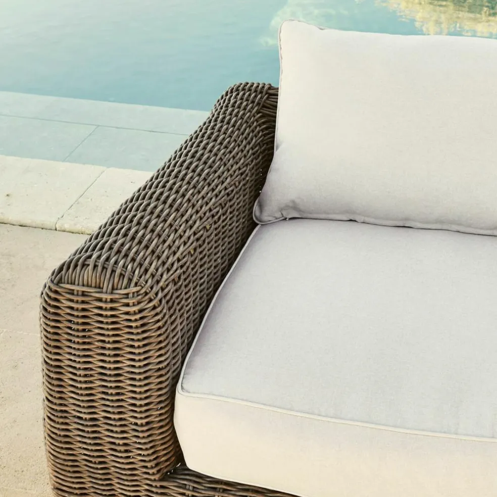 Geflechtmöbel aus der Naturfaser Rattan sind echte Klassiker unter den Gartenmöbeln. Die ihre Blütephase allerdings in einer Zeit hatten, als ausreichend Platz in den Nebengebäuden der Landsitze und viele dienstbare Geister zur Hand waren, um die eleganten Möbel bei schlechtem Wetter schnell ins Trockene zu holen. Heute haben Möbel aus der Kunstfaser Polyethylen die Vorherrschaft im Outdoor-Bereich übernommen, denn es gelingt ihnen auf bewundernswerte Weise, die natürliche Ausstrahlung der Naturfaser perfekt zu imitieren, sie aber mit bester Wetterfestigkeit zu kombinieren. Deshalb werden Sie gar nicht wissen, was Sie an dieser Sitzgruppe als erstes bewundern sollen: die elegante Form mit den extrabreiten Arm- und Rückenlehnen? Oder das besonders ebenmäßige Geflecht, das von einem erfahrenen Korbflechter im traditionellen Stil über einem stabilen Alugestell angebracht wurde? Oder die Vielzahl der warmen Braun-Nuancen, mit denen das helle Creme der Kissen perfekt harmoniert? Oder die mittelfeste Polsterung, die sanft stützt, aber weder zu weich noch zu hart ist? Oder doch die Wetterbeständigkeit der Sitzgruppe, die auch keinerlei Pflege braucht? Die Lösung ist ganz einfach: Mal die eine, mal die andere gute Eigenschaft wertschätzen – und jede Stunde in der exklusiven Sitzgruppe genießen!