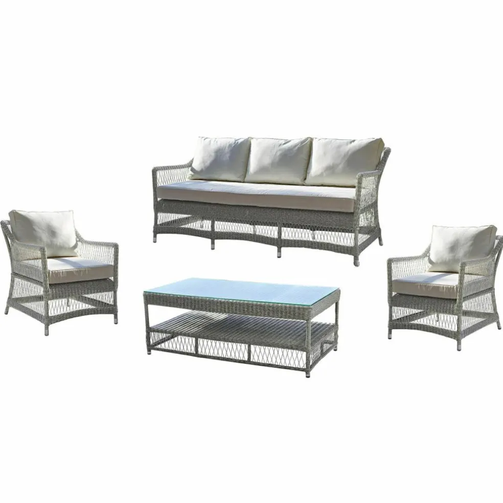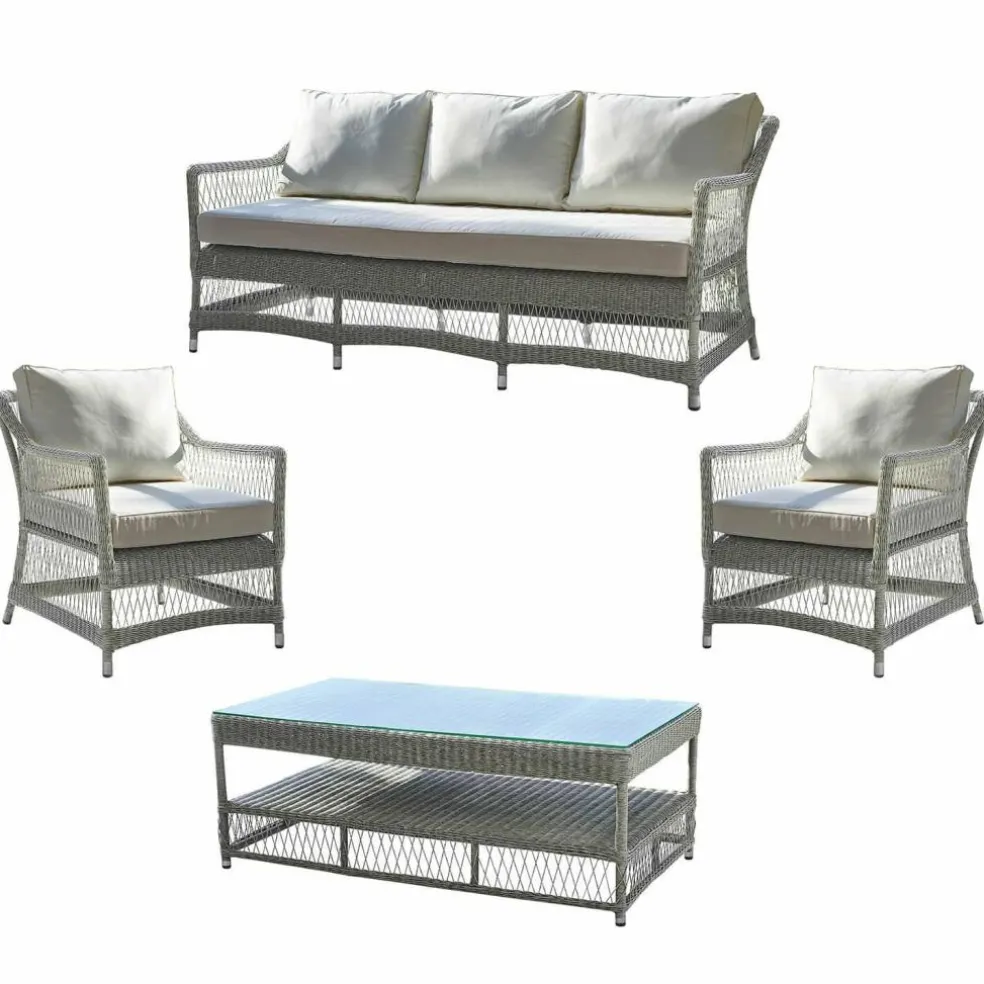 Wunderschön, absolut wetterfest und äußerst langlebig. Sie verleiht Garten und Terrasse elegantes Flair und bietet ihrer Familie und Gästen echten Sitzkomfort. Die Gestelle bestehen aus Aluminium und einem Geflecht aus hochwertigen Synthetikfasern. Das Geflecht hat eine besonders schöne Farbgebung: Eher grau mit einem dezenten Grünschimmer, zieht sie so alle Blicke auf sich! Es sieht echtem Rattan zum Verwechseln ähnlich, ist aber deutlich widerstandsfähiger und fasert nicht. Die Polster sind ebenso langlebig, leicht zu reinigen und zudem extrem schnelltrocknend. Die massive Glasplatte, die auf dem Tisch thront, unterstreicht ebenfalls den hohen Qualitätsanspruch.