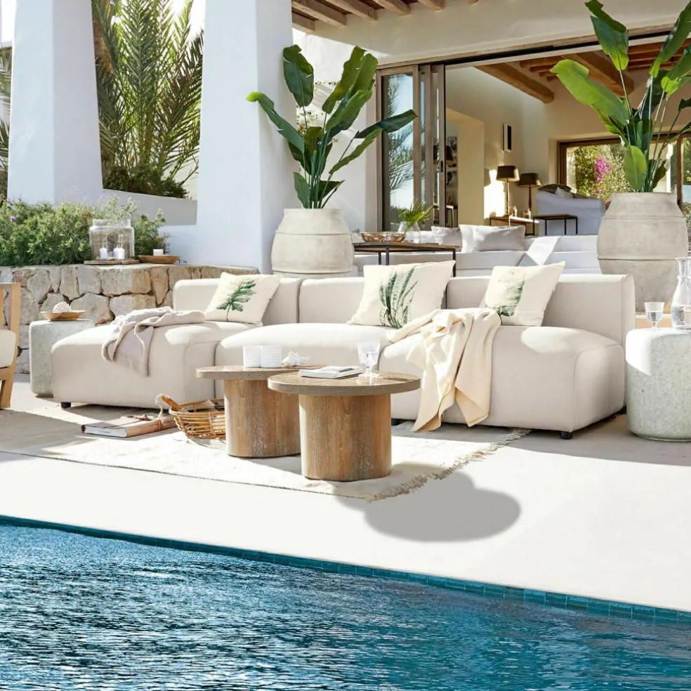 Entdecken Sie die Symbiose aus stilvollem Design und praktischer Funktionalität mit dieser Sitzgruppe für den Außenbereich. Die sanfte Cremefarbe harmoniert mit der Natur und schafft eine Atmosphäre der Entspannung. Die Bezüge, gefertigt aus hochwertigen Olefinfasern, sind nicht nur angenehm auf der Haut, sondern auch außerordentlich strapazierfähig. Ein herausragendes Merkmal ist die Quick-Dry-Schaumstoffpolsterung, die nach einem Sommerregen rasch wieder trocknet und somit Unterbrechungen der Entspannung minimiert. Die weiche und einladende Polsterung gewährleistet unvergleichlichen Sitzkomfort, der Sie das Innere Ihres Hauses vergessen lässt. Diese Sitzgruppe, bestehend aus zwei kleinen und einem großen Sofamodul, erlaubt es Ihnen, den Außenbereich ganz nach Ihren Wünschen zu gestalten, während das Quick-Dry-Feature für dauerhafte Bequemlichkeit sorgt. Die Quick-Dry-Polsterung wurde in Deutschland entwickelt. Sie ist besonders offenporig designt. Das sorgt dafür, dass Wasser optimal und vor allem schnell abfließen kann. Zudem sorgen die offenporige Struktur für eine dauerhafte Luftzirkulation. Auf diese Weise bildet sich keine Staunässe und die Polsterung kann innerhalb kürzester Zeit trocknen. Das macht unsere Polster einfach perfekt für den Einsatz auf Terrasse und Balkon.