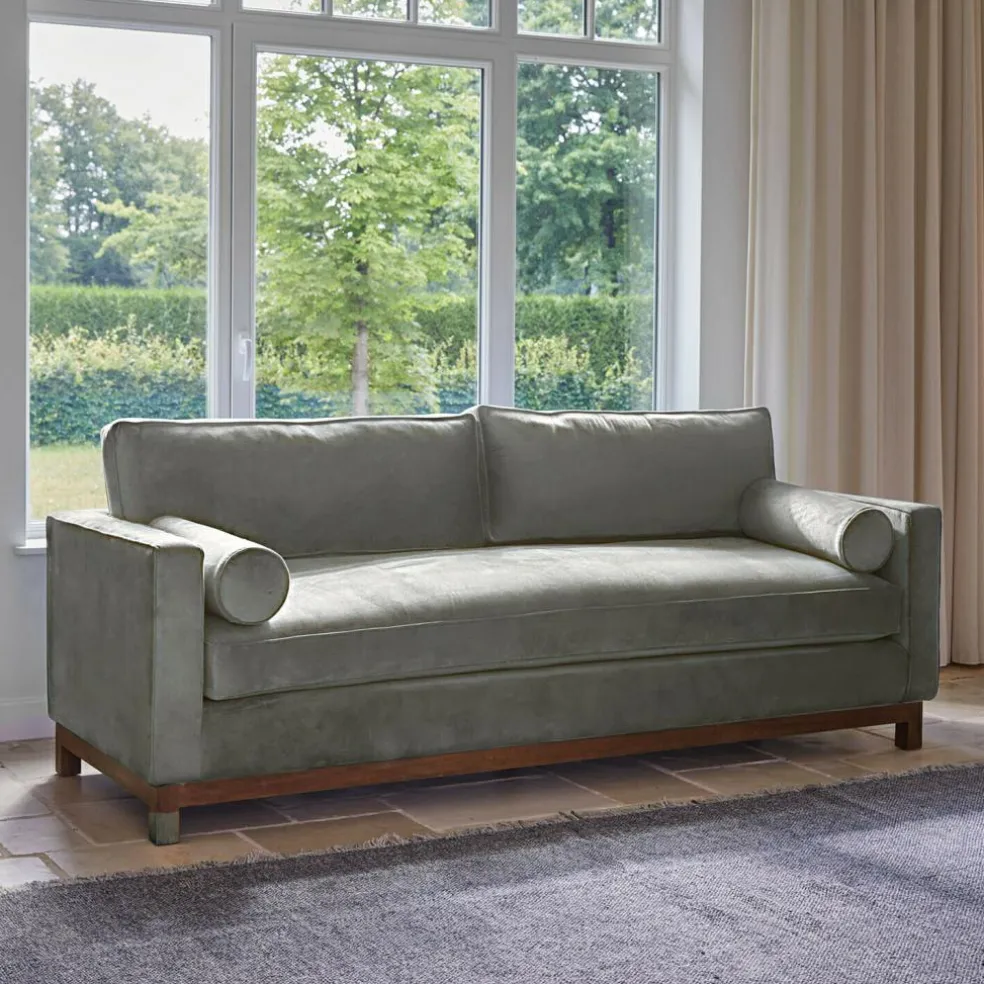 Dieses Sofa bringt Ruhe in den Raum – nicht durch Zurückhaltung, sondern durch seine entschlossene Formensprache. Geradlinige Armlehnen, ein tief angesetzter Korpus und die klar definierte Sitzfläche verleihen ihm eine architektonische Ausstrahlung. Zwei markante Rollenkissen setzen nicht nur einen formalen Akzent, sondern laden auch zum Anlehnen, Ablegen oder Entspannen ein. Der Bezug aus weichem Samt verleiht dem Design eine wohnliche Note – mit feiner Haptik und dezentem Glanz. Die abnehmbaren Kissenrollen-Bezüge runden das durchdachte Design funktional ab. Ein Möbelstück, das durch seine Klarheit überzeugt – und durch seine behutsame Raffinesse.