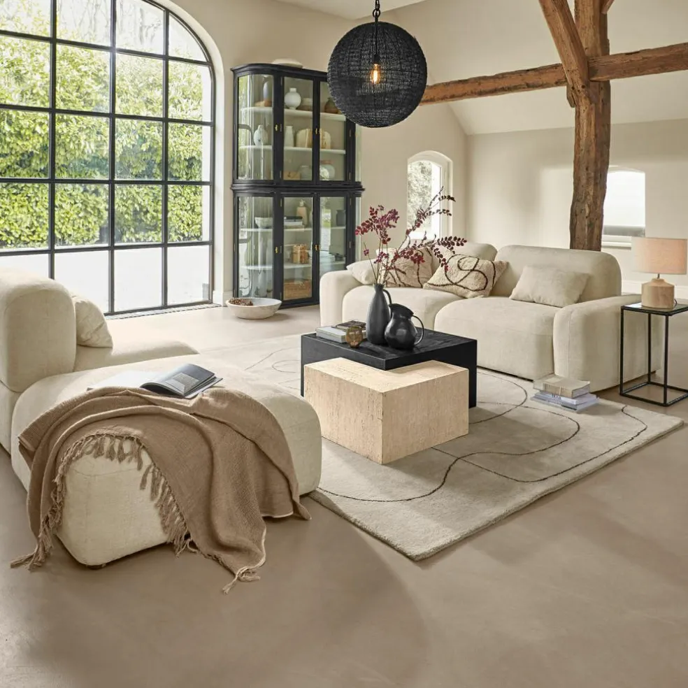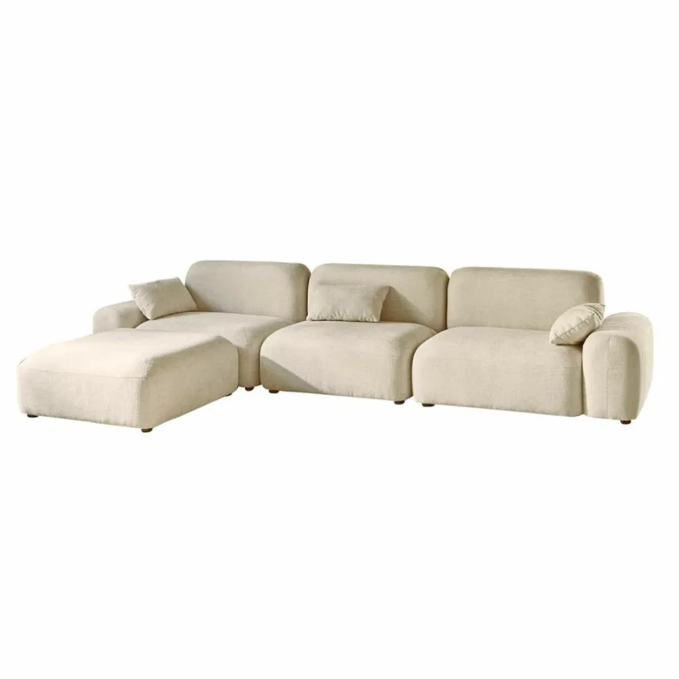 Dieses Ecksofa ist mehr als nur ein Möbelstück – es ist ein flexibler Wohlfühlort, der mitdenkt. Die einzelnen Elemente lassen sich ganz nach Belieben arrangieren, und der Hocker kann durch ein cleveres Verbindungssystem an jedem Platz fixiert werden. Ob als großzügige Liegefläche, klassische L-Form oder lockere Wohninsel – Ihrer Kreativität sind keine Grenzen gesetzt. Die angenehm straffe Polsterung sorgt dabei für langanhaltenden Komfort. Ein besonderes Highlight ist der edel strukturierte Stoffbezug, der sich sanft wie feiner Samt anfühlt und gleichzeitig eine dezente Wohnlichkeit verströmt. Ideal für alle, die ihr Wohnzimmer flexibel und stilbewusst gestalten möchten. Mit seinem tiefen, großzügigen Sitz und der niedrigen Rückenlehne bringt dieses Modell die entspannte Lässigkeit urbaner Wohnwelten in Ihr Zuhause.