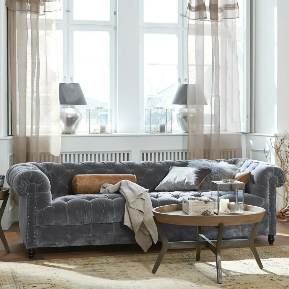Das Chesterfield-Sofa ist der zeitlose Einrichtungsklassiker schlechthin. Unser Modell ist besonders hochwertig und punktet mit charakteristischen Details. Das Gestell wird aus reinem Mangoholz gefertigt und ist dadurch langlebig und robust. Eine erstklassige und vor allem formstabile Polsterung sorgt für idealen Sitzkomfort. Die stilvolle Knöpfung wird in traditioneller Handarbeit angebracht und sorgt für eleganten Charme. Prächtige Ziernägel zieren die Vorderseiten der Lehnen, die Füße aus gedrechseltem Vollholz bilden den perfekten Abschluss.