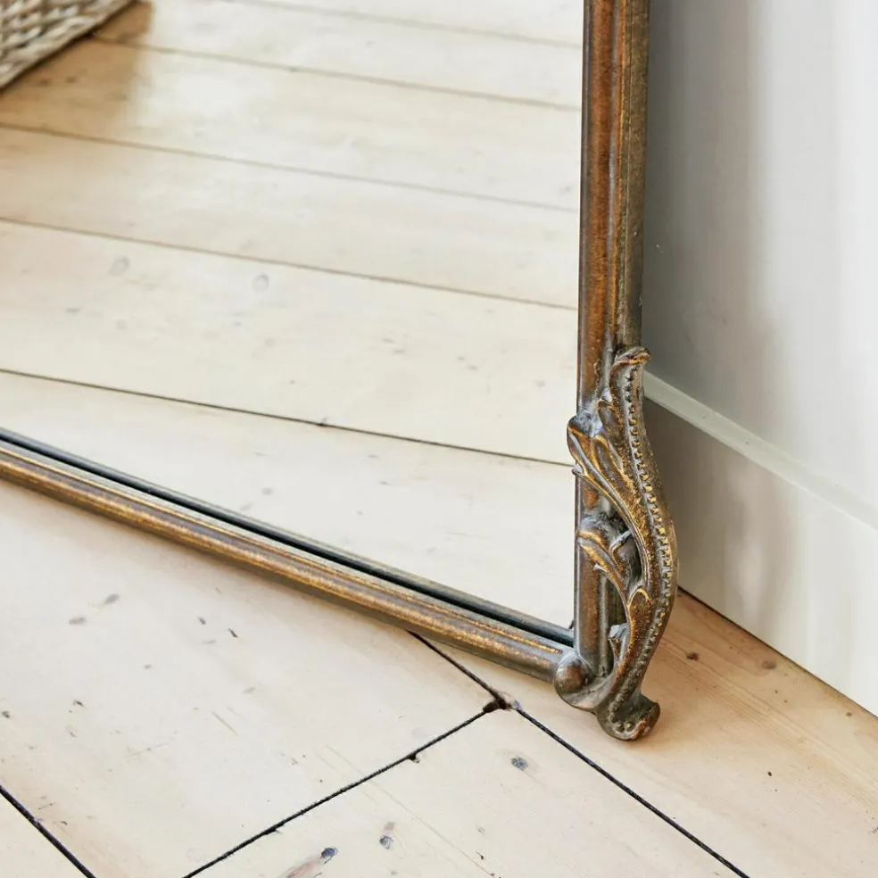 Spiegel wie dieser zierten schon vor Jahrhunderten elegante Salons oder Boudoirs und sind auch heute noch beliebte Raum-Objekte, denn sie verbinden eine praktische Funktion mit einem exklusiven Look. Wirkt dieser Spiegel nicht, als hätte er schon Damen in klassischen Empire-Kleidern, in eng taillierten Biedermeier-Kostümen oder mondänen Charleston-Roben gesehen? Aber so sehr der Spiegel mit seinen opulenten Ornamentverzierungen an vergangene Zeiten erinnert, so nonchalant wird er auch ein modernes Outfit wie Jeans und Shirt widerspiegeln. Ja, eigentlich ist der Kontrast zwischen alt und neu auf diese Weise noch interessanter als früher. Der fein profilierte Rahmen ist ganz aus stabilem Metall gefertigt und die üppigen Verzierungen – vor allem jene am Kopfteil sowie die floralen Elemente am unteren Abschluss – zeugen von der Kunstfertigkeit des Handwerkers. Mit seinem antiken Look fügt sich der Spiegel perfekt in einen klassisch eingerichteten Schlaf- oder Wohnraum, er bildet aber auch den aparten Eyecatcher in Zusammenspiel mit modern-cleanem Möbel-Design. Zum Aufhängen ist der Spiegel mit stabilen Haken auf der Rückseite ausgestattet. Sie können das Prunkstück aber auch einfach lässig an die Wand lehnen – bei seiner Größe von knapp 190 cm zeigt er Sie trotzdem perfekt von Kopf bis Fuß.