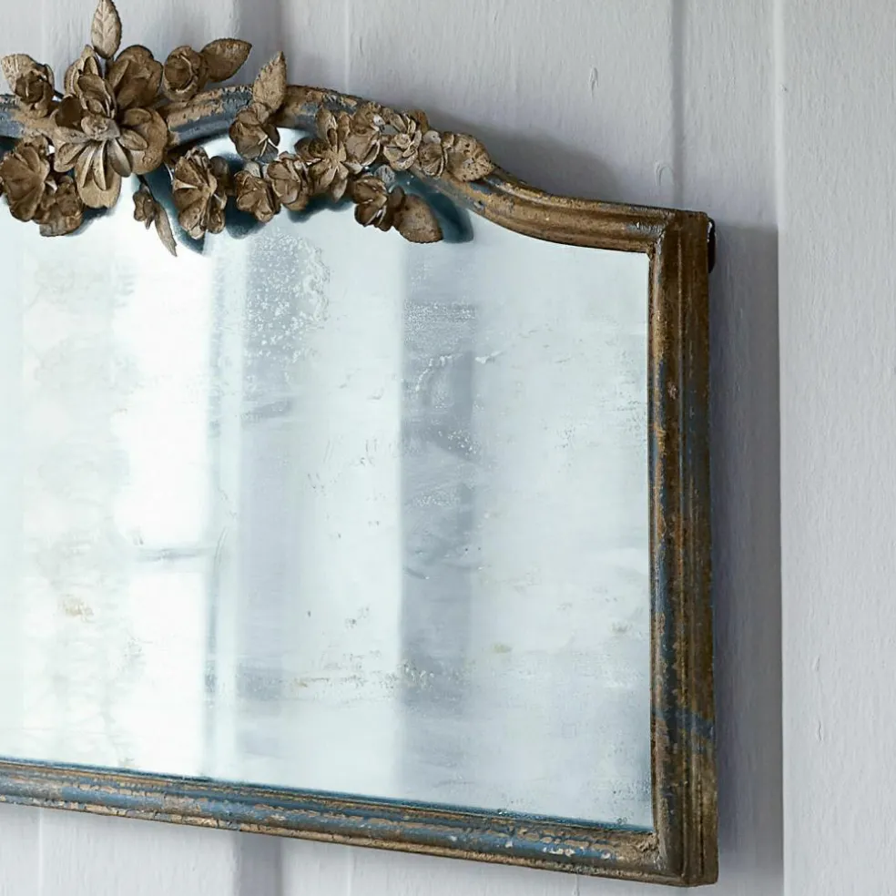 In welchen Boudoirs mag er schon gehangen haben, welche Frisuren und Kleidungsstile mögen im Laufe der Jahrhunderte an ihm vorbeigezogen sein? Diese Erlebnisse werden für immer sein Geheimnis bleiben, doch ein bisschen von der geheimnisvollen Aura ist auch heute noch spürbar, wenn wir uns in diesem Spiegel zu betrachten versuchen. Dabei fasziniert das Antik-Finish der Spiegelfläche ebenso wie der aufwändig gestaltete Rahmen. Dieser ist ein Meisterwerk traditioneller Metallkunst, was sich auch an seinem stattlichen Gewicht ablesen lässt. Die herausragende Blickfangwirkung hat der Spiegel aber dem perfekten Zusammenspiel aus der nostalgischen Formgebung mit den opulenten Verzierungen aus Blüten und anderen floralen Elementen zu verdanken, die ihm den begehrten Erbstück-Charakter geben. Und ihn gleichzeitig zu einem wertvollen Raum-Objekt machen, das seinen nostalgischen Zauber in vielen Wohnsituationen entfalten wird. Ob Sie ihm im Wohnraum einen Platz über einer zierlich gestalteten Kommode oder über dem Sofa geben, ob Sie seinen Anblick im Schlafzimmer genießen möchten oder ob er im Entrée des Hauses Ihre Gäste stilvoll begrüßen soll, liegt ganz in Ihrem Ermessen und Ihren individuellen Wünschen. Sie können aber sicher sein, dass sich dieses Prachtstück im Shabby-Chic in jeder Situation von seiner besten Seite zeigen wird.