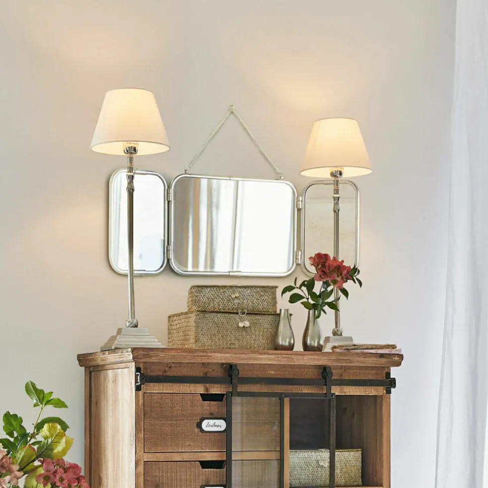 Dieser dreiteilige Spiegel ist mehr als ein praktisches Accessoire für Bad, Schlafzimmer oder Flur – er ist ein Kunstwerk für sich. Jeweils gefasst in einen filigranen, silberfarbenen Messingrahmen, wirken die drei hochwertigen Spiegelelemente wie ein weit geöffnetes Fenster mit klappbaren Fensterläden. Und der Vergleich passt, denn: Die äußeren Spiegel lassen sich ganz einfach nach innen klappen. Mit einer Kette zum Aufhängen.