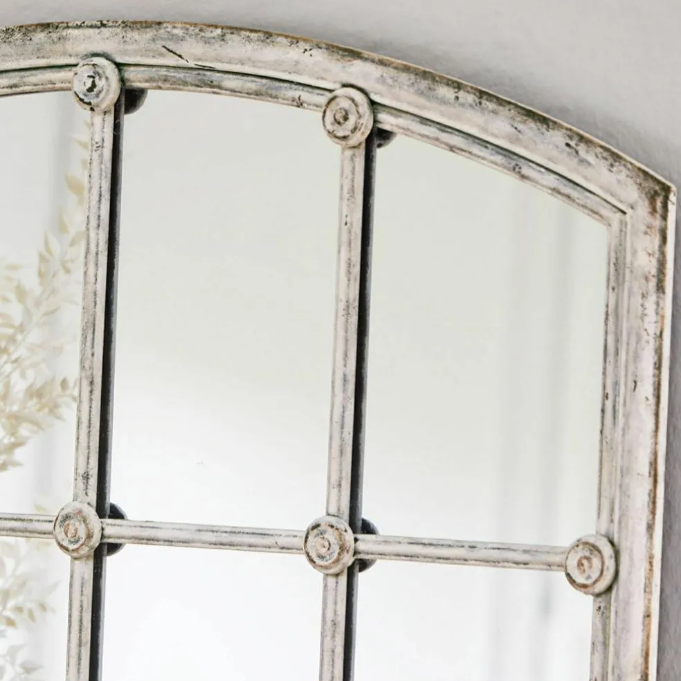Man könnte glatt meinen, dass es sich hier um ein wunderschönes Fundstück aus einer alten Scheune handelt. Die auf die Spiegelfläche aufgesetzten Sprossen machen dieses prachtvolle Accessoire zu einem echten Hingucker. Ebenso das zauberhafte Antik-Finish. Dieses verleiht dem Teil den unverkennbaren Vintage-Charme. Trotz der imposanten Größe gelingt die Anbringung an der Wand spielerisch. Dafür sorgen zwei stabile Metallösen auf der Rückseite. Doch auch angelehnt an die Wand schmückt das gute Stück den Raum. Die meisterhafte Fertigung des Rahmens aus Eisen sorgt für Stabilität und gibt diesem ganz besonderen Hingucker eine sehr hochwertige Optik. Das auffällige aber dennoch leicht wirkende Design fügt sich toll in den Wohnraum ein. So passt dieses Meisterwerk gleichermaßen zu Interior im Landhaus-Stil, Shabby-Chic oder als gewollter Stilbruch zum modernen Industrial-Living.