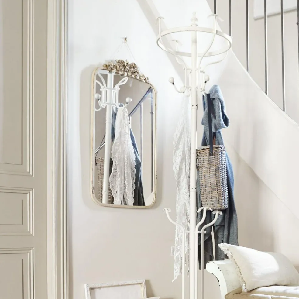 Wer romantisches Interior liebt, findet in diesem prachtvollen Blickfang wahrscheinlich das neue Lieblingsstück. Man könnte fast meinen, es handele sich um ein sehr altes Objekt, das über viele Jahrzehnte hinweg die Wand eines eleganten Anwesens auf dem Land geschmückt hat. Ein wunderschöner Rahmen aus Eisen umrandet die großzügige Spiegelfläche. Den oberen Bereich ziert ein kunstvoll gestaltetes, florales Ornament. Es verleiht dem Objekt eine besonders romantische Note. Die authentisch gearbeiteten Abnutzungsspuren im hellen Lack betonen den verträumten Vintage-Charme des Spiegels. Durch diese Art der Verarbeitung erscheint der Rahmen je nach Lichteinstrahlung immer in einer etwas anderen Farbgebung. Das macht den Spiegel tatsächlich einzigartig. Für eine stabile Befestigung an der Wand sorgen die zwei Haken auf der Rückseite. Sehr schön sieht dieser Eyecatcher auch an die Wand gelehnt aus, etwa auf einer nostalgischen Kommode oder einem Konsolentisch. Das reizvolle Design passt ganz hervorragend zum beliebten Shabby Chic und zum französischen Landhaus-Stil. Auch zu klassischem Interior setzt dieser Hingucker einen einzigartigen Akzent. Ob im Schlafzimmer, im Flur, im Ankleidezimmer oder im Wohnzimmer – mit diesem Teil entsteht in jedem Raum sofort ein zauberhaftes Ambiente.