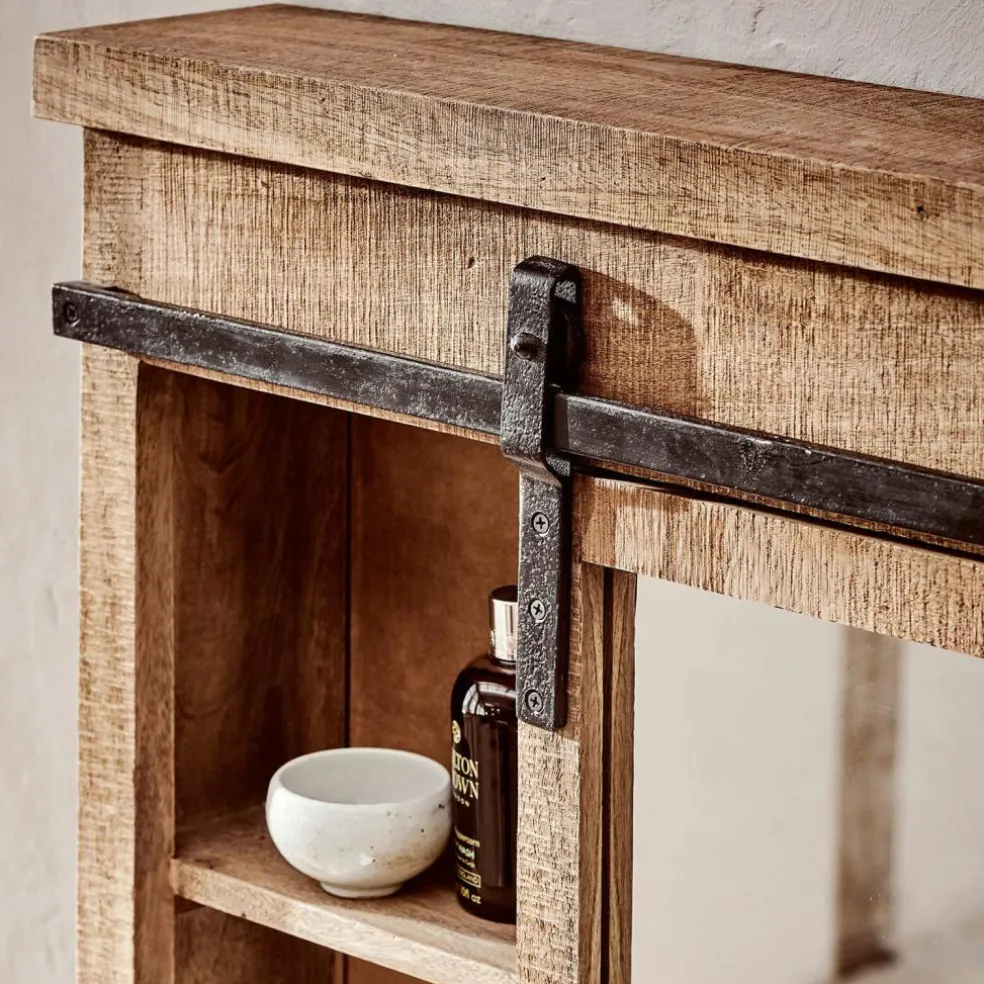 Wussten Sie, dass die erste Stunde des Tages darüber entscheidet, wie gut gelaunt wir sind? Beim morgendlichen Gang ins Badezimmer nach dem Aufwachen tut dieser Spiegelschrank alles für Ihre glückliche Einstimmung auf den Tag. Bereits seine schöne Optik bezaubert und schenkt jeden Tag aufs Neue Freude. Das Schmuckstück besteht aus hochwertigem und widerstandsfähigem Mangoholz, das durch seine natürliche Maserung bezaubert, während die Schiebevorrichtung aus Eisen für einen rustikalen Akzent sorgt. Das Spiegelelement ist frei verschiebbar, sodass Sie frei variieren können, worauf Sie direkt zugreifen wollen. Besser können Ihr Shampoo, Parfüm, Nagellack oder Make-up nicht aufbewahrt werden. Aber natürlich gilt das auch für alle Herren-Utensilien – vom Rasierschaum bis zum Kamm. Übrigens: Der schicke Spiegelschrank harmoniert perfekt zum Waschtisch 17052.