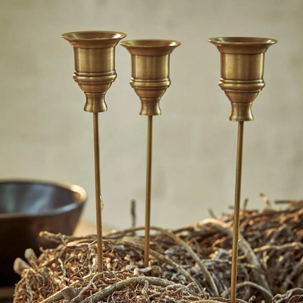 Dieses nostalgische Trio überrascht mit einem raffinierten Design – die drei schönen Messing-Kerzenhalter lassen sich nämlich ganz leicht einstecken, vielleicht in einem Blumentopf, einem Gefäß mit Sand oder in einem Tischgesteck. So können Sie ganz kreativ werden und sich über einen romantischen Lichtakzent freuen, vielleicht auch in einem winterlichen Kranz arrangiert. Das edle Trio versprüht den Charme früherer Tage und passt ideal zum Shabby-Chic. Sie können sich das ganze Jahr daran erfreuen und Ihr Zuhause in ein heimeliges Licht tauchen. Die schlanke Form, perfekt für Stabkerzen, hat eine besondere Eleganz und schmeichelt jedem Zimmer.