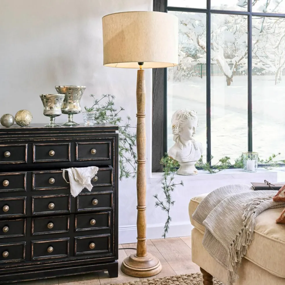 Ein Stück Ruhe und Natürlichkeit für Ihr Zuhause – diese Stehlampe begeistert mit einem liebevoll gedrechselten Fuß aus naturbelassenem Mangoholz. Jede Rundung erzählt von traditioneller Handwerkskunst, jede Holzzeichnung bringt ein Stück Ursprünglichkeit in den Raum. Gekrönt wird die Leuchte von einem sanften Leinen-Schirm, der das Licht weich filtert und eine behagliche Atmosphäre schafft. Ob im Wohnzimmer neben dem Lieblingssessel oder im Schlafzimmer als stimmungsvolle Lichtquelle – dieses Modell vereint rustikale Bodenhaftung mit sanfter Lichtpoesie.