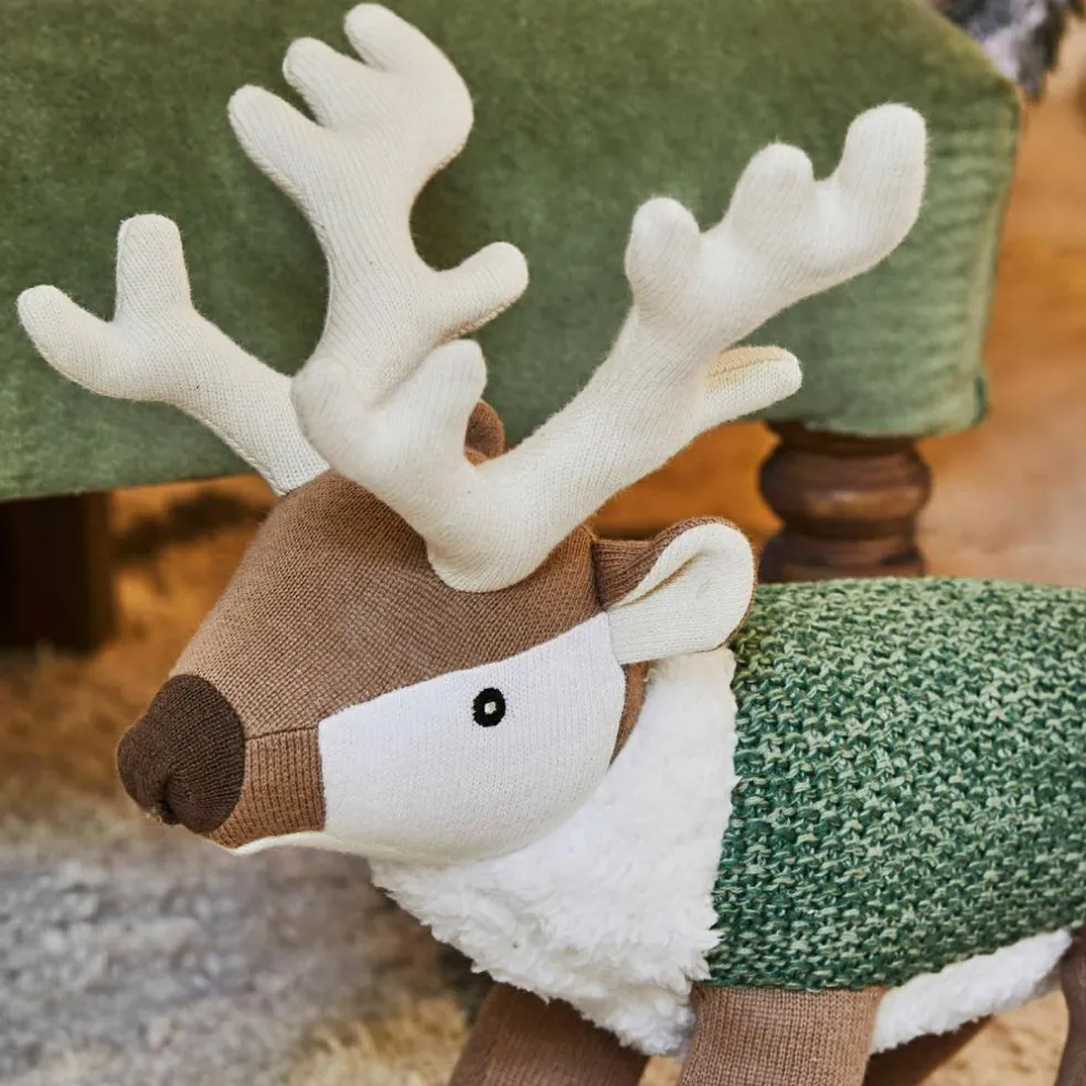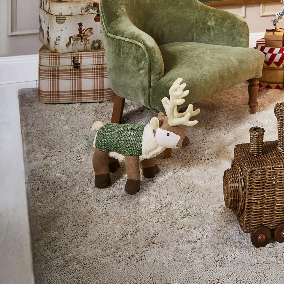 Ob unter dem Tannenbaum, auf dem Bett oder als treuer Weggefährte in der Winterzeit – dieses liebevoll gestaltete Stoffrentier bringt Gemütlichkeit und Weihnachtszauber ins Kinderzimmer. Sein Körper kombiniert weichen Bouclé mit feiner Strickoptik in warmem Tannengrün, ergänzt durch beigefarbene Beine und ein charmantes Gesicht mit freundlichem Blick. Besonders die unterschiedlichen Materialien machen das Rentier zu einem haptischen Erlebnis für kleine Hände. Dank der weichen Füllung lässt es sich herrlich knuddeln, während das waschbare Material dafür sorgt, dass es auch im turbulenten Familienalltag ein treuer Begleiter bleibt.