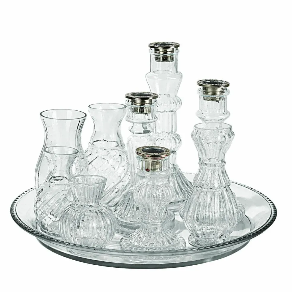 Dieses Set aus zierlichen Kerzenhaltern und Vasen, präsentiert auf einem runden Glas-Tablett, lädt zu kreativen Dekorationen ein. Die unterschiedlichen Formen der Kerzenständer und Vasen sorgen für ein abwechslungsreiches und dennoch harmonisches Gesamtbild. Jeder einzelne Bestandteil wirkt wie ein kleines Kunstwerk aus Glas, dessen transparente Schönheit im Kerzenschein oder im Licht von Frühlingsblumen erstrahlt. Die Kerzenhalter bieten Platz für schmale Stabkerzen, während die Vasen mit zarten Blumenarrangements gefüllt werden können, um Ihre Tafel, Anrichte oder Ihren Wohnzimmertisch in eine festliche Szenerie zu verwandeln. Das Set ist eine wunderbare Möglichkeit, Ihre Räume mit Licht und floraler Schönheit zu füllen und gleichzeitig einen Hauch von zeitloser Eleganz zu verbreiten.
