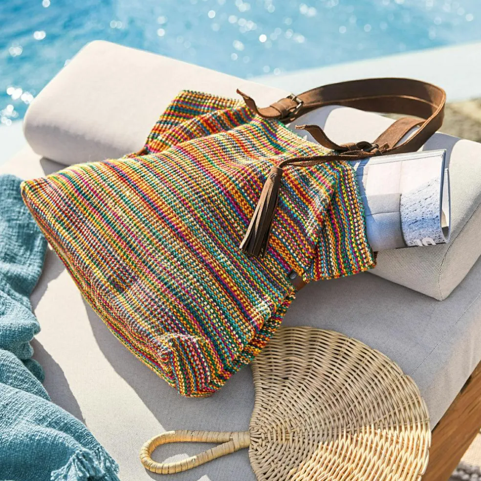 Diese modische Tasche macht mit ihrem bunten Boho-Look sofort gute Laune. Sie besteht außen aus farbenfroher, geflochtener Jute und innen aus reiner Baumwolle – ein angenehm natürlicher Mix. Der Henkel und die dekorative Tassel sind aus echten Rindsleder. Die Länge der Henkel lässt sich verstellen, und eine Innentasche bewahrt Schlüssel, Handy und mehr griffbereit und sicher auf. Diese schöne und geräumige Tasche ist der perfekte Begleiter in der Freizeit, ob zum Stadtbummel, auf dem Markt oder in einer Ausstellung. Sie gibt jedem Outfit eine verspielte und stilvolle Note.