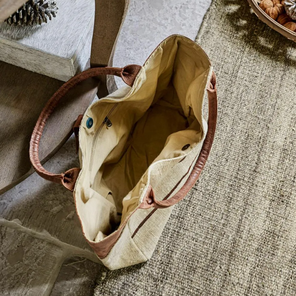 Ein modisches Accessoire mit natürlichem Charme – diese schicke Tasche überzeugt mit einem Mix aus Jute und Baumwolle, das die Oberfläche auch herrlich robust macht. Die Henkel sind dabei aus Rindsleder, was ebenfalls für die hochwertige Qualität der Tasche spricht. Sie ist klassisch und zeitlos designt sowie stabil und geräumig, sodass sie perfekt für die Freizeit geeignet ist. Für Ausflüge am Wochenende, den Shoppingbummel oder auch als Begleitung im Büro macht sie immer eine gute Figur. Das entspannte Design passt zum Beispiel gut zu legeren Jeans-Looks und bietet Raum für alles Wichtige unterwegs wie auch für kleinere Einkäufe.