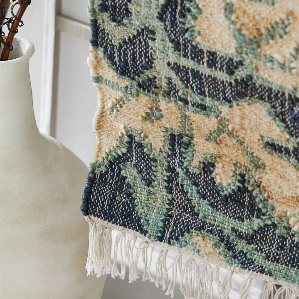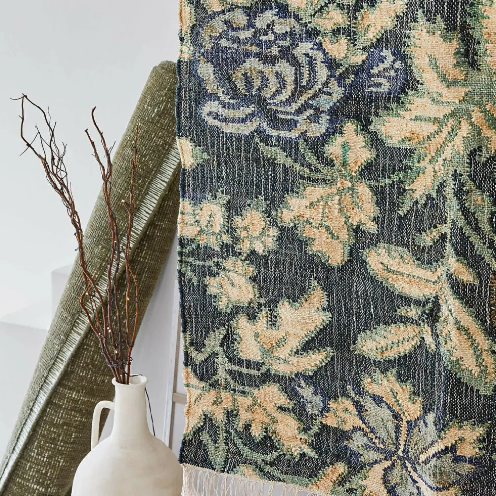 Dieser Teppich verbindet florale Opulenz mit rustikaler Handwerkskunst. Großflächige Blüten in warmen Erdtönen und gedämpftem Grün entfalten sich auf dunklem Grund wie ein Gemälde alter Meister – detailreich, lebendig und voller Ausdruck. Die Kombination aus natürlicher Jute und weicher Baumwolle erzeugt eine angenehme Struktur, während die flachgewebte Verarbeitung ihn zu einem idealen Begleiter für Wohn- und Schlafzimmer macht. Handgeknüpft und mit Fransen veredelt, strahlt er eine wohnliche Wärme und zeitlose Schönheit aus – perfekt für Räume, die Charakter zeigen dürfen.