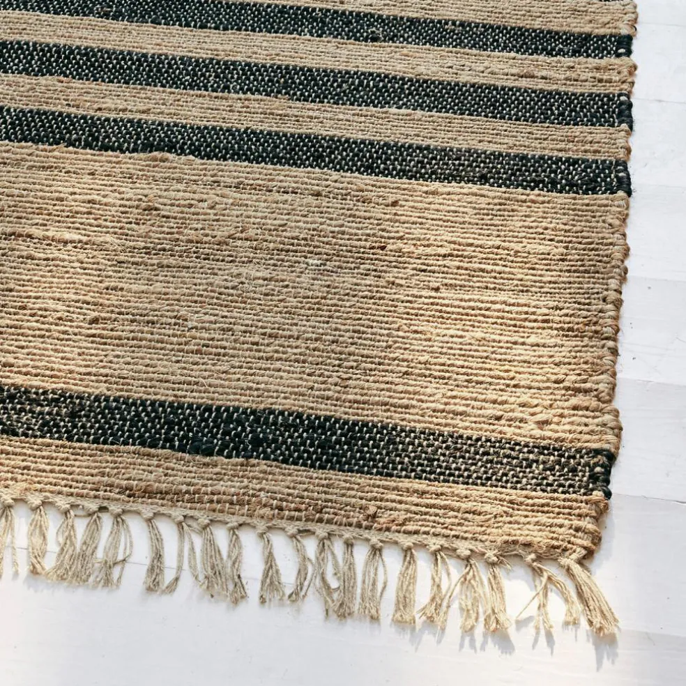 Für ein angenehmes Ambiente im Raum mit einem natürlichen Akzent sorgt dieses ansprechende Stück im zeitlos schönen Design. Gefertigt ist es aus dem hochwertigen Naturmaterial Hanf. Dieses fühlt sich nicht nur äußerst angenehm auf der Haut an und verlockt dazu, barfuß durch die Wohnung zu laufen, es ist auch langlebig und ein nachhaltiger Rohstoff. Die Hanfpflanze ist anspruchslos und wächst schnell nach. Zudem kann sie fast überall angebaut werden und lässt sich mehrfach recyceln. Somit ist das schöne Teil wunderbar für Wohnungen mit Accessoires aus Naturmaterialien geeignet. Die Ränder des Teppichs schmücken zarte Fransen. Ansprechende, garngefärbte Streifen in einem dunkleren Ton verleihen dem Gewebe im angenehmen Naturton einen zeitlos schönen Akzent. In der Küche, im Flur oder Eingangsbereich oder im Wohnzimmer ist das Teil ein sehr harmonischer Hingucker, der eine gewisse Ruhe ausstrahlt. Auch vor dem Bett ist er mehr als nur ein schöner Blickfang. Direkt nach dem Aufstehen ist es angenehm, mit den Füßen auf das hautsympathische Material zu steigen. So beginnt der Tag ganz entspannt mit einem guten Gefühl. Doch ganz gleich wo im Haus das zauberhafte Accessoire seinen Charme spielen lassen darf – Freude bereitet es garantiert. Ob zum Long-Island- oder zum Landhaus-Stil, zu Interior mit naturnaher Note oder zu rustikaler Einrichtung, dieses Piece fügt sich ganz harmonisch in den Raum ein und zieht die Blicke auf sich.