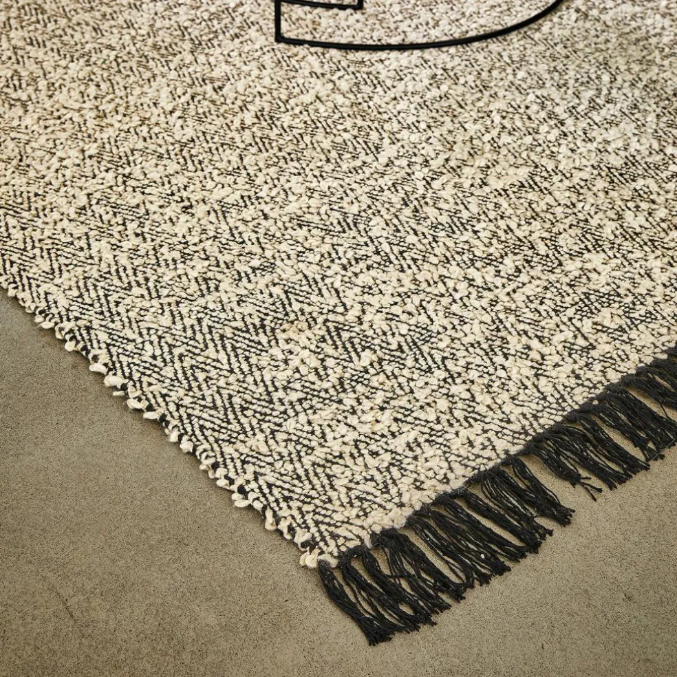 Dieser exquisite handgewebte Teppich besticht durch seine Schwarz-Weiß-Musterung und die auffälligen, schwarzen Fransen an den kurzen Seiten. Die fein gearbeitete Textur und die weiche Haptik sorgen für ein angenehmes Gefühl unter den Füßen. Die einzigartige Kombination aus Schlaufenfransen an den langen Seiten und langen Fransen an den kurzen Seiten verleiht dem Teppich einen stilvollen und modernen Look. Die Rückseite aus Baumwolle bietet zusätzliche Stabilität und Komfort.