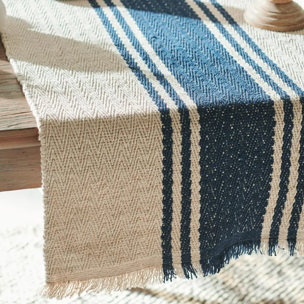 Auch noble Tischwäsche gehört zum stilvollen Repertoire des französischen Landhaus-Looks. Da darf auch dieser edle Tischläufer nicht fehlen, der mit einem klassischen Streifen-Design alle Blicke auf sich zieht. Die hochwertige Qualität aus naturreiner Baumwolle ist charakteristisch, auch die traditionelle Jacquard-Webart, die eine besonders schöne und lebendige Fischgrätstruktur zeigt. Selbstverständlich ist auch das Streifenmuster fadenfein eingewebt – und bewahrt selbst nach vielen Wäschen seine hohe Farbintensität. Ein zeitloser Klassiker, der wie geschaffen ist für den alltäglichen Gebrauch – und Ihren Esstisch auf der Terrasse genauso veredelt wie Ihren großzügigen Holztisch im Innenbereich. Für Tafelfreuden mit Gästen schaffen Sie in Kombination mit natürlichem Steingut-Geschirr und rustikalen Weingläsern eine gemütliche und gleichzeitig stimmungsvolle Atmosphäre.