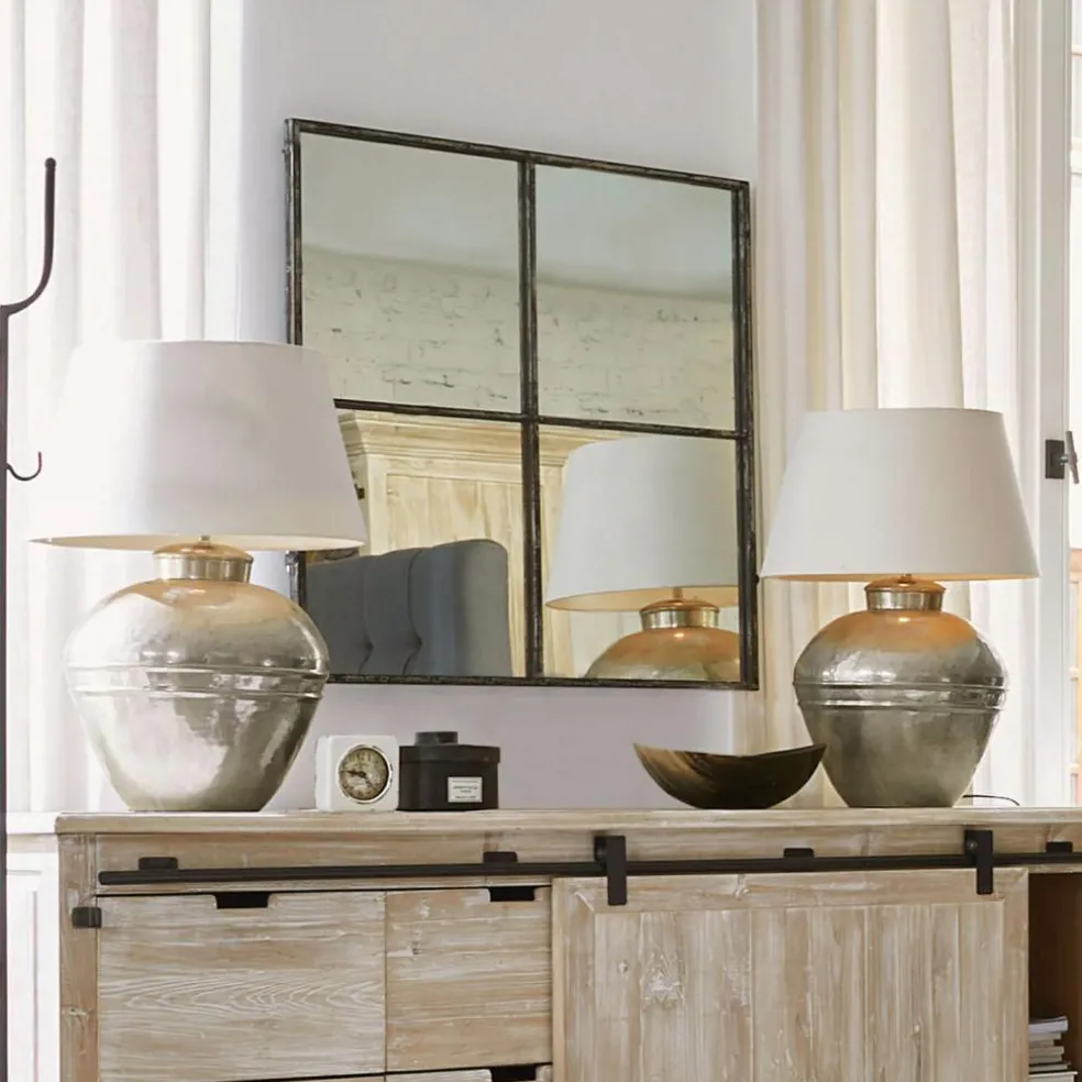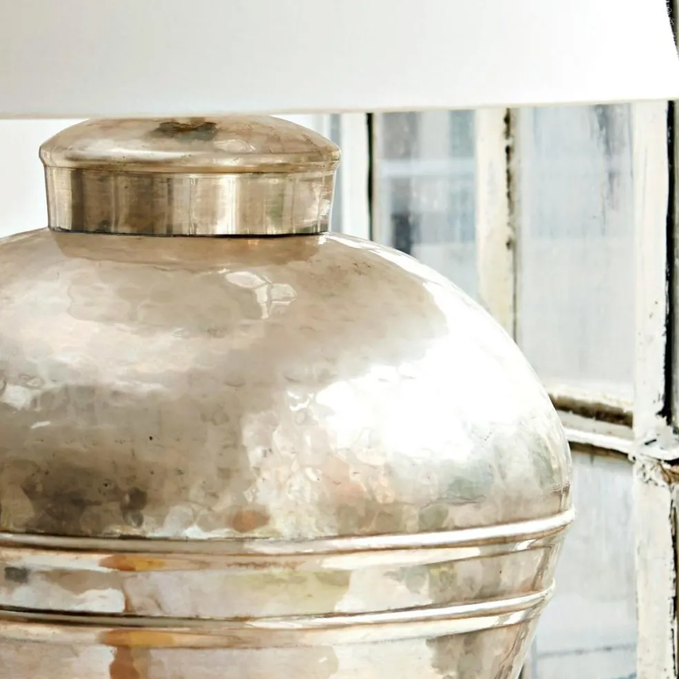 Der aufwendig in Hammerschlag-Technik gearbeitete Lampenfuß aus reinem Messing wird dank des eleganten Finishs in Antiksilber zum buchstäblichen Highlight Ihrer Einrichtung. Und das Beste: Keine Tischlampe ist wie die andere, denn echte Handarbeit macht jedes Stück zu einem Unikat. Der schnörkellose, cremefarbene Lampenschirm aus 100 % Baumwolle setzt dem edlen Look schließlich die Krone auf. Schön zu einer klassischen Einrichtung oder einem Ambiente im Long-Island- oder Landhaus-Chic.