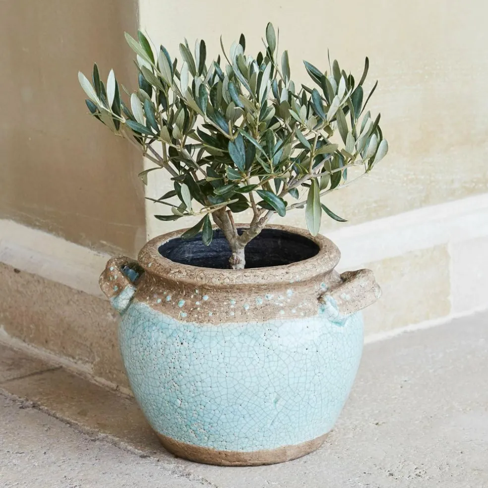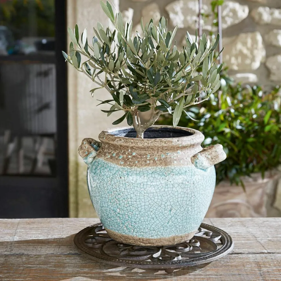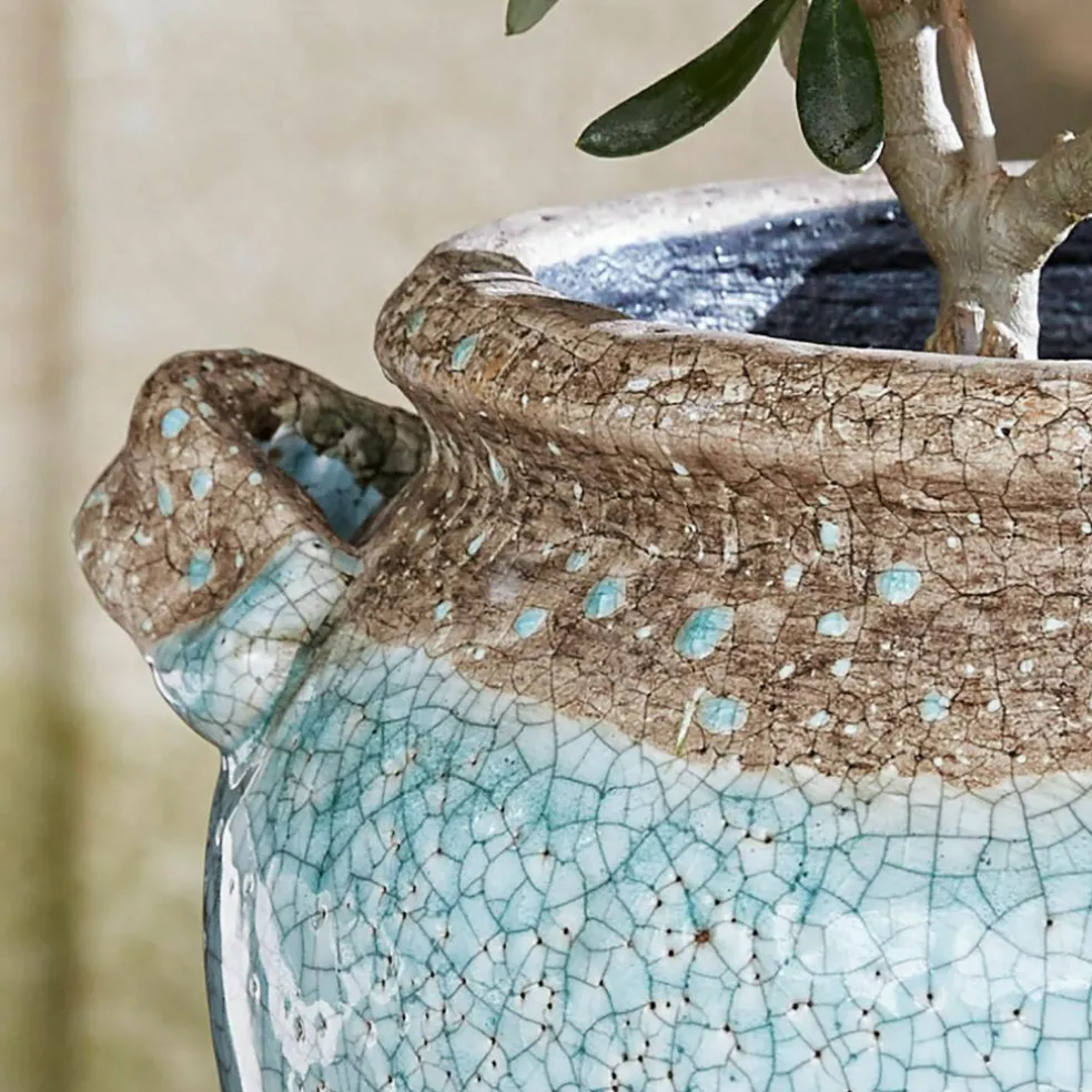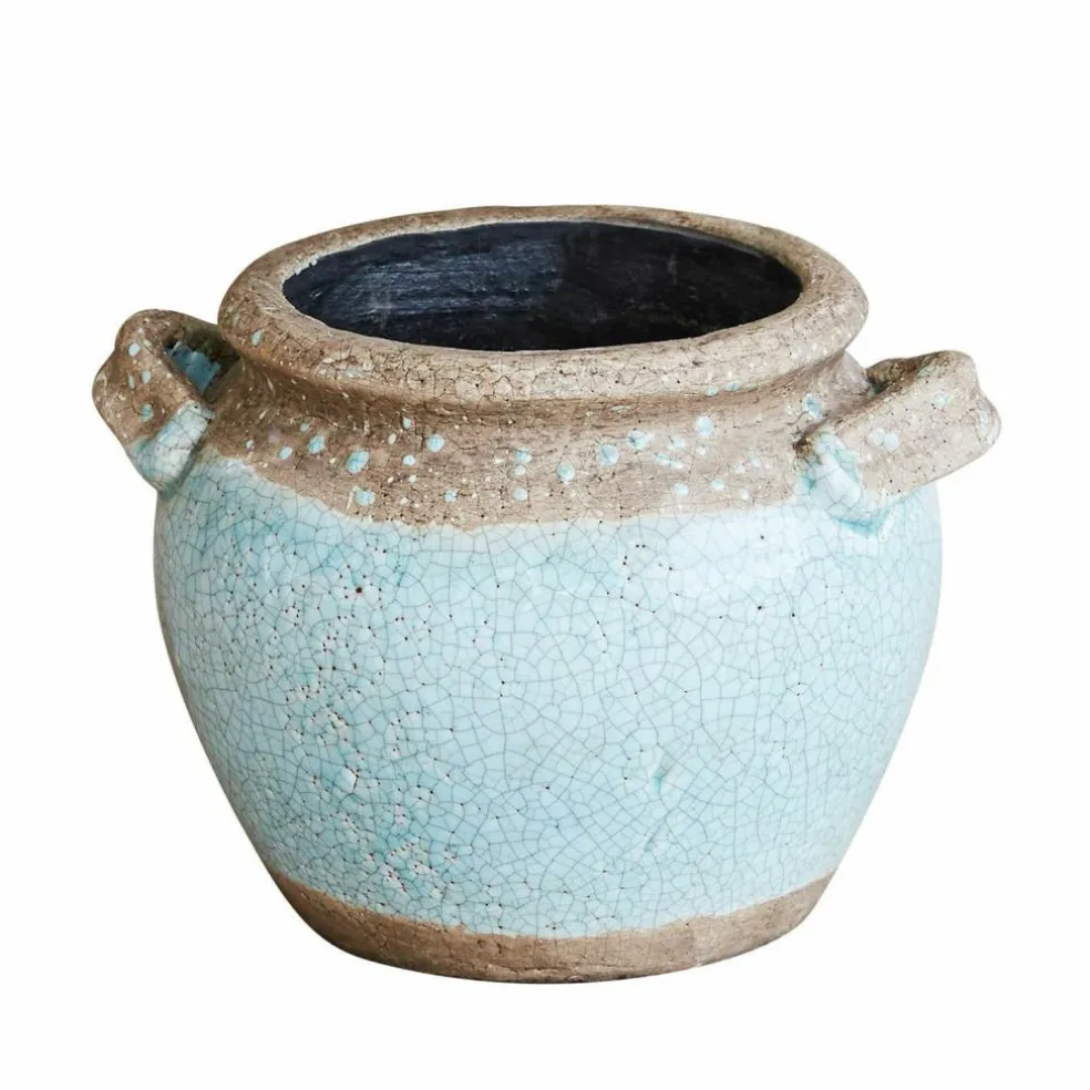 Dieser hübsche Übertopf mit kleinen Henkeln bringt den Charme des Mittelmeeres zu Ihnen. Seine mediterrane Note entführt uns optisch in den sonnigen Süden. Er bietet das ideale Plätzchen für Gräser, Grünpflanzen und Blüten, die sich darin dank des naturnahen Materials besonders wohlfühlen. Auch Küchenkräuter könnten Sie hier hübsch einpflanzen, und so immer frisches Basilikum und Co. naschen. Auf dem Balkon, der Fensterbank oder im Garten versprüht dieser schön gestaltete Übertopf ein angenehmes Urlaubsflair. Wer mag, könnte ihn alternativ auch zum Aufbewahren kleiner Gegenstände nutzen – ein Multitalent.