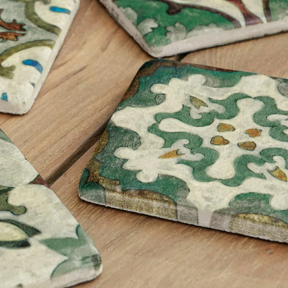 Orientalisch anmutende, streng geometrische Ornamente zieren dieses Untersetzer-Set, kein Muster gleicht dem anderen, jedes ist ein handgemaltes Unikat. Die Verbindung zum Orient kommt übrigens nicht von ungefähr, denn dort liegt die Wiege der traditionellen Fliesenkunst. Mit den Arabern kamen die farbenfroh bemalten Keramikfliesen nach Spanien und verbreiteten sich schnell im ganzen Mittelmeerraum, denn dem besonderen Charme dieses Boden- oder Wandschmucks konnte sich niemand entziehen. Bis heute nicht. Dieses Untersetzer-Set sieht seinen antiken Vorbildern zwar sehr ähnlich, wurde aber nicht aus klassischer Keramik, sondern aus dem modernen Kunststein Polyresin gefertigt und anschließend von Hand mit den traditionellen Mustern bemalt. Jeder Untersetzer hat eine rutschfeste Kork-Unterseite, die kostbare Möbelflächen schont. Ob im indoor-Bereich oder auf dem Gartentisch, ob unter Trinkgläsern oder solo – das Untersetzer 4er Set ist immer und überall ein bezaubernder Blickfang.