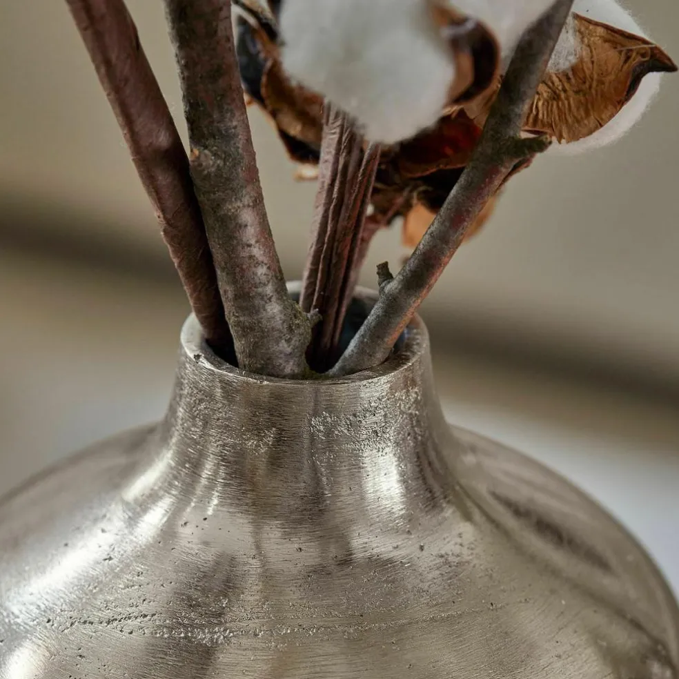 Wenn kühles Metall eine Geschichte erzählt, klingt sie rau, glänzend und ausdrucksstark – genau wie dieses Vasen-Set aus Aluminium. Die bewusst unruhige, fast „verkratzte“ Oberfläche wirkt wie eine Momentaufnahme in Bewegung: Lichtreflexe tanzen, Schatten brechen sich in der Textur. Die beiden unterschiedlich geformten Gefäße ergänzen sich harmonisch und setzen moderne wie klassische Interieurs gekonnt in Szene. Ob mit Zweigen, Trockenblumen oder pur – ihre Wirkung entfalten sie ganz mühelos.