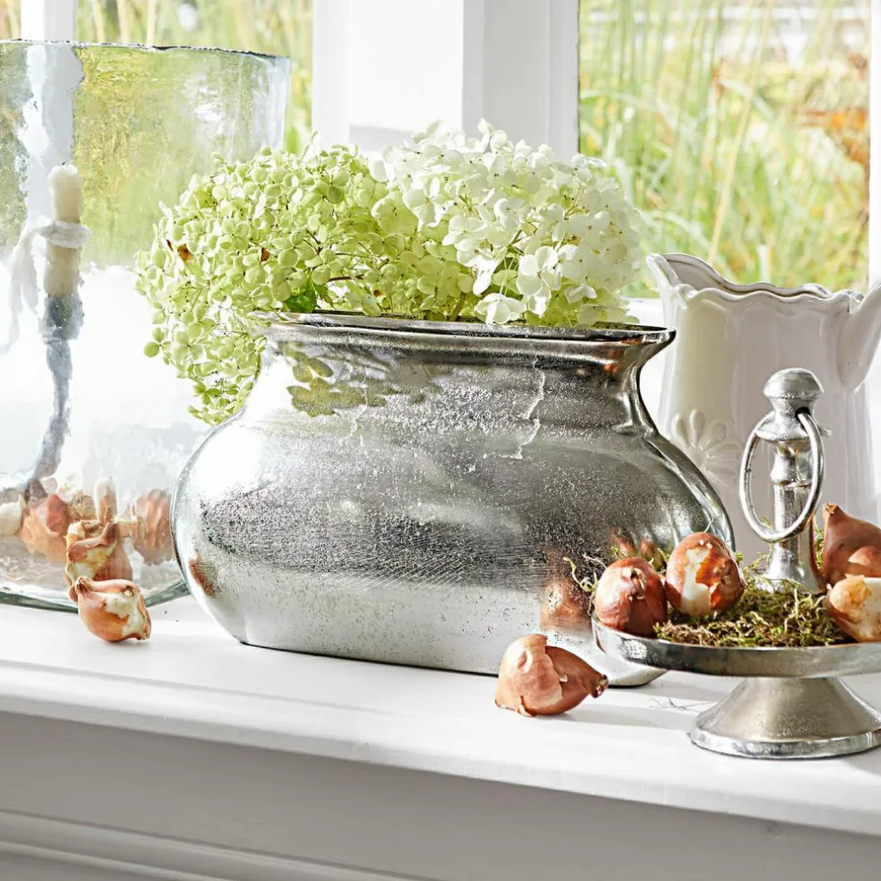 Entdecken Sie die zeitlose Schönheit dieser außergewöhnlichen Vase aus massivem Aluguss. Ihre längliche Form und das glänzende, silberfarbene Finish fangen das Licht auf wunderbare Weise ein und setzen bezaubernde Akzente in Ihrem Interieur. Die glatte, leicht strukturierte Oberfläche verleiht der Vase eine einzigartige Haptik und bringt eine gewisse Raffinesse in jede Umgebung. Ob gefüllt mit farbenfrohen Blumen oder als eigenständiges Kunstwerk – diese Vase zieht alle Blicke auf sich und bereichert Ihr Zuhause mit einer modernen, luxuriösen Note. Platzieren Sie sie auf einem Sideboard, dem Esstisch oder in einem Regal, um Ihre Einrichtung stilvoll aufzuwerten.