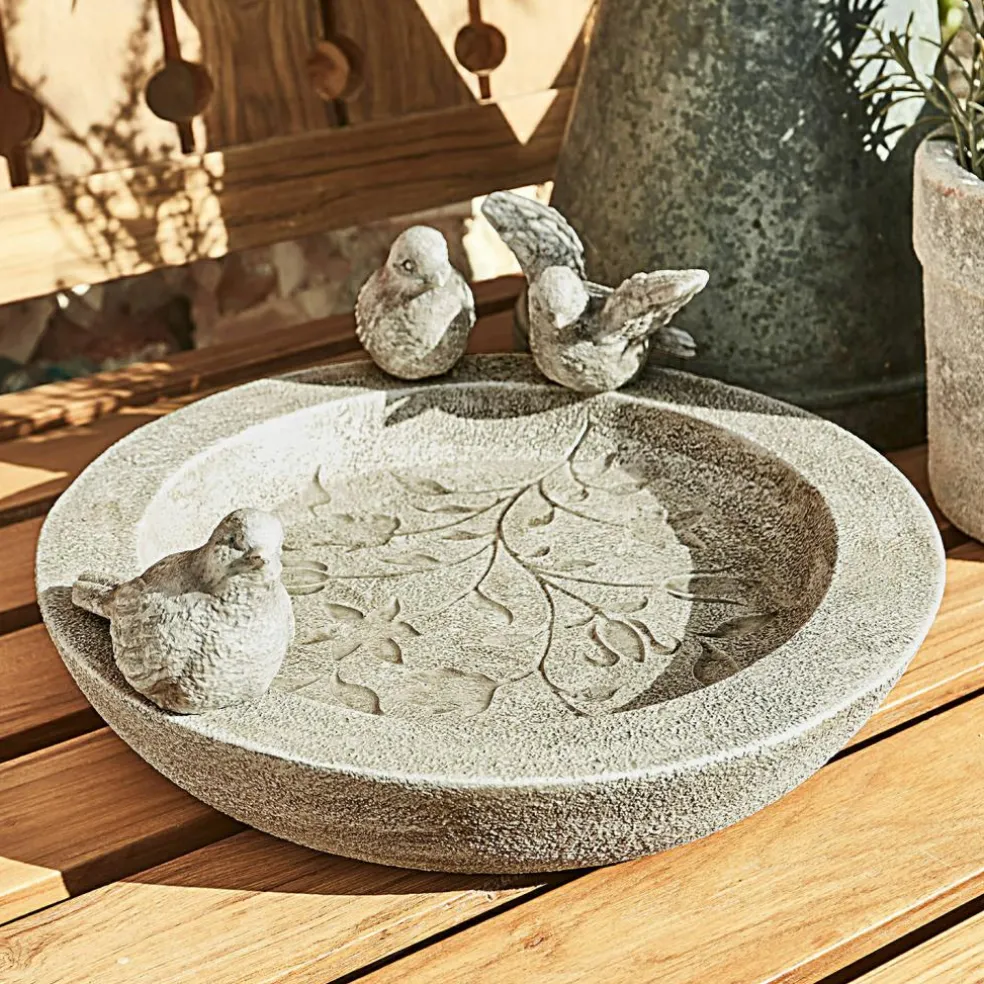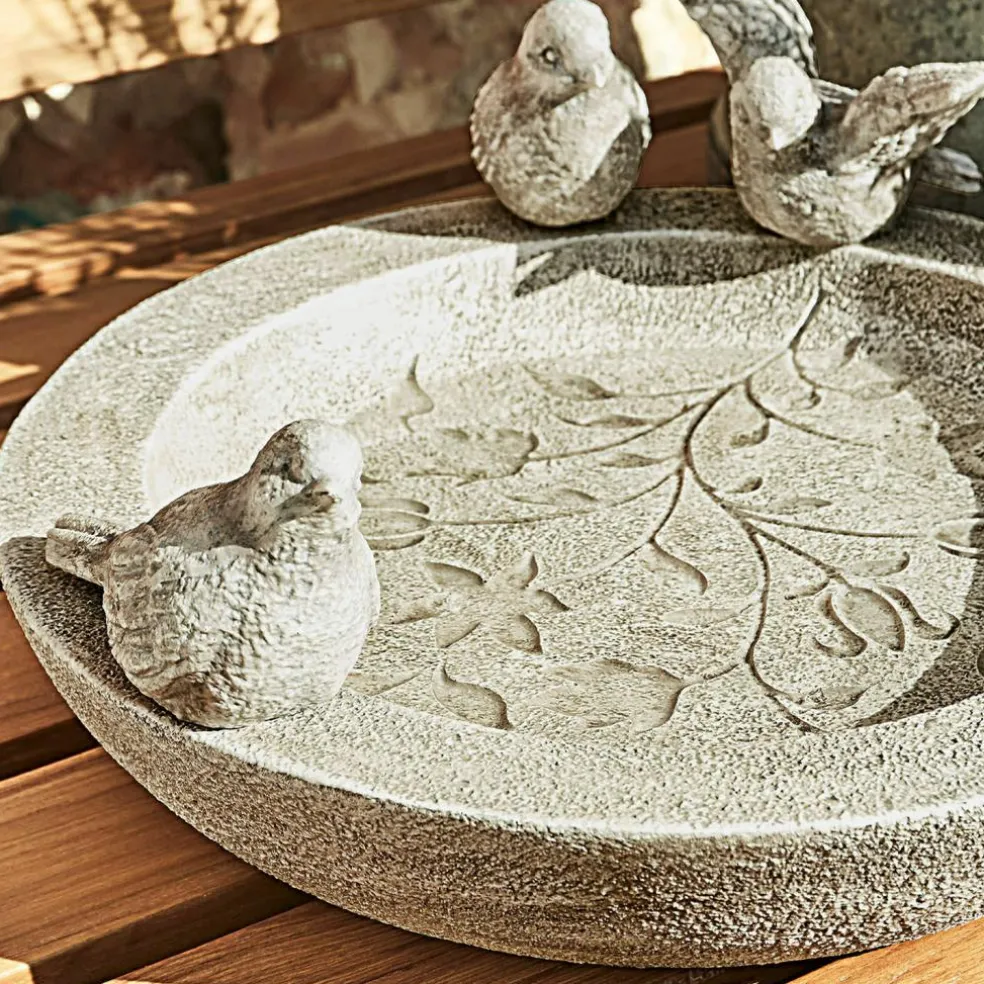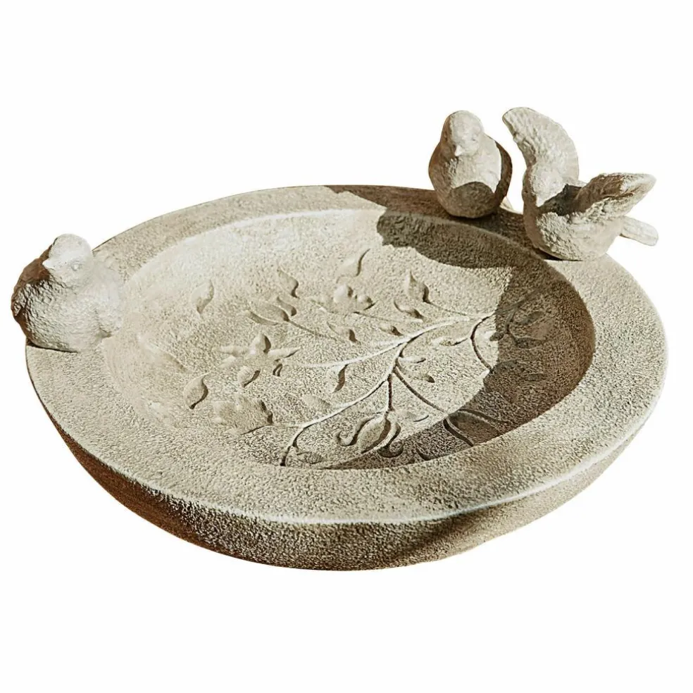 Verlockende Einladung für Ihre gefiederten Freunde: Dieses dekorative Vogelbad ist nicht nur hübsch anzusehen, es ist auch liebevoll gefertigt. Besonders schön sind dabei die von Hand eingearbeiteten Blatt-Verzierungen. Es ist so fein gestaltet, dass alles wie echter, leicht verwitterter Stein wirkt. Die kleinen Vögelchen, die auf dem Rand sitzen, machen den Eindruck perfekt, als handle es sich um ein kostbares Relikt aus einem historischen Schlossgarten.