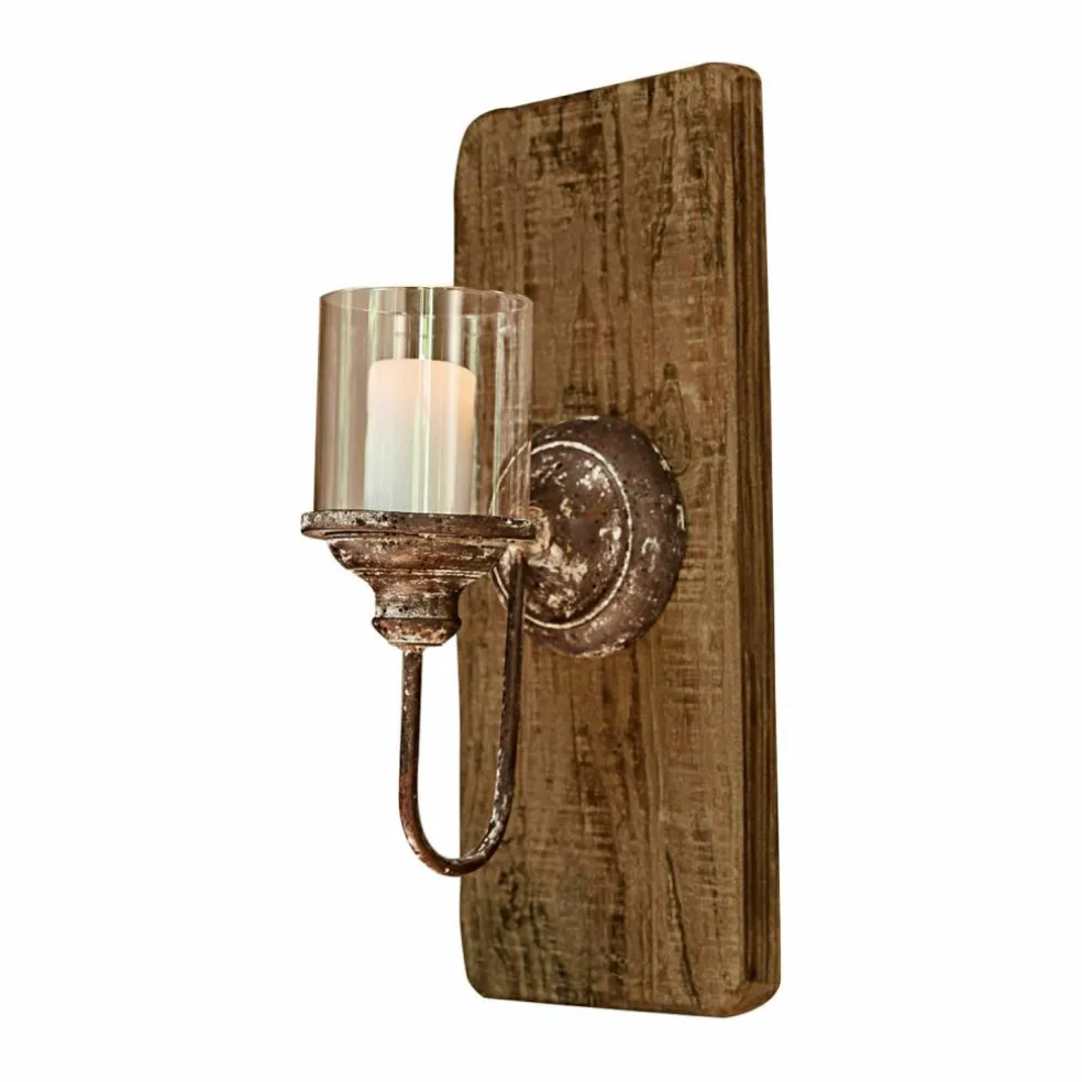 Das warme, lebendige Licht einer Kerze vermittelt einen Hauch von Romantik, der sich einfach durch nichts ersetzen lässt. Ein schöner Wandkerzenhalter ist aber nicht nur Lichtspender, sondern auch ein dekoratives Highlight jedes Zuhauses. Dieses Exemplar fügt sich mit seinen hochwertigen Materialien und einer dezenten Silhouette nahtlos in jedes Interieur ein. Seine Basis aus wiederaufbereitetem Kiefernholz weist eine besonders attraktive Maserung auf, die perfekt mit dem antiken Finish des Eisengestells harmoniert. Der formschöne Glaszylinder punktet mit schlichter Eleganz, sorgt für eine gleichmäßige Lichtstreuung und rundet das Design gekonnt ab. All diese Vorzüge machen den Wandkerzenhalter zu einem echten Hingucker, ganz gleich, ob in Wohnzimmer, Küche oder auf einer überdachten Terrasse.