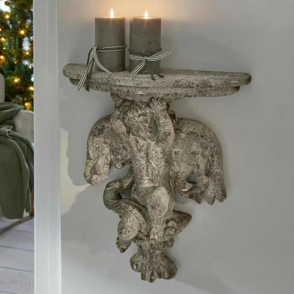 Wie aus einer alten Kapelle entnommen, bringt dieses Wandregal ein Stück vergangener Handwerkskunst in Ihre Räume. Die ausdrucksvolle Engelsfigur mit ihren detaillierten Flügeln, dem lockigen Haar und der kindlichen Anmut trägt die Konsole über dem Kopf – eine verspielte wie kunstvolle Darstellung, die sofort ins Auge fällt. Die Oberfläche in markanter Steinoptik wirkt, als hätte Wind und Wetter sie über Jahrzehnte hinweg geformt. Perfekt, um eine einzelne Vase, eine kleine Skulptur oder eine Kerze in Szene zu setzen – und dabei selbst zum Blickfang zu werden.