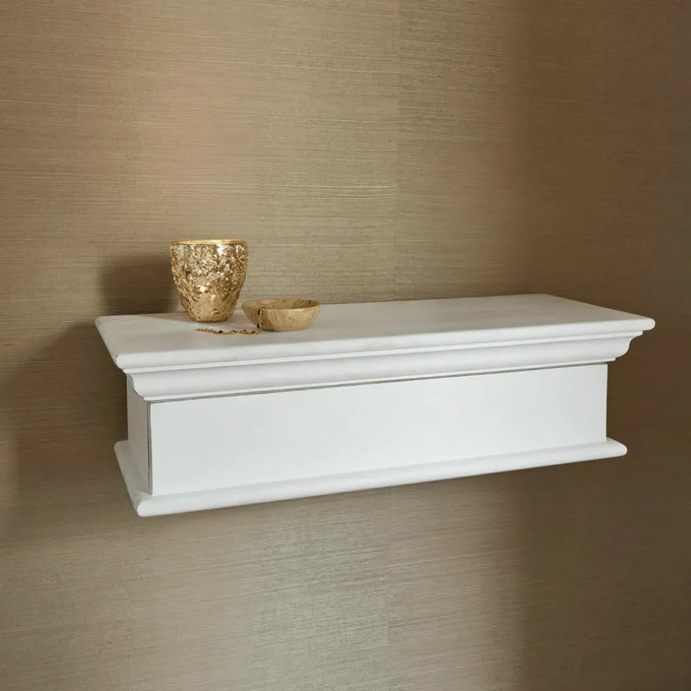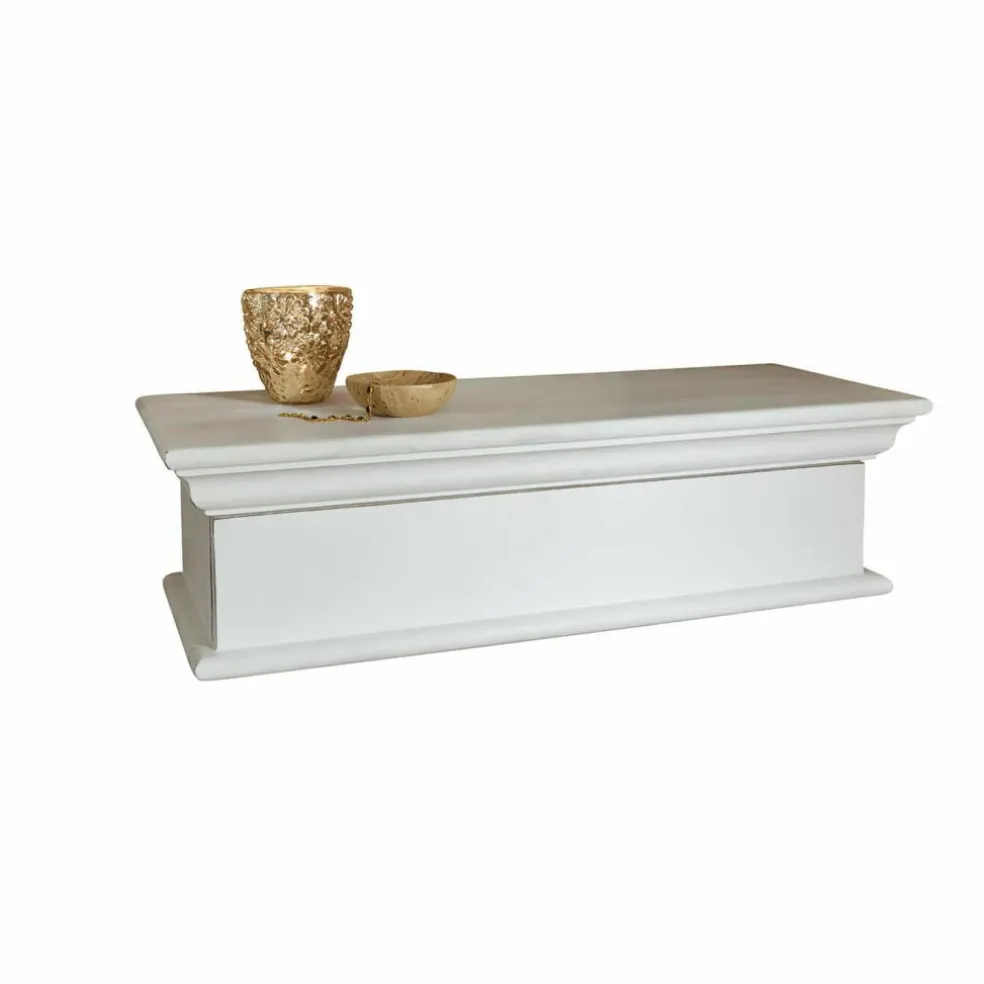 Verleihen Sie Ihrem Zuhause einen Hauch von Eleganz und praktischer Funktionalität mit diesem charmanten Wandregal aus hochwertigem Mangoholz. Durch das fein abgestimmte Antik-Finish erhält das Stück eine zeitlose Note, die in jede Raumecke eine warme, einladende Atmosphäre bringt. Die sorgfältig gestaltete Kranzleiste hebt die Konturen hervor und ergänzt das Gesamtbild um eine Dimension der Raffinesse. Unterhalb der Ablagefläche befindet sich eine handliche Schublade, die diskreten Stauraum für Alltagsgegenstände bietet. Dieses Wandregal ist nicht nur eine stilvolle, sondern auch eine praktische Ergänzung für Ihr Interieur, perfekt geeignet, um Ihre Lieblingsbücher, Familienfotos oder dekorative Stücke zur Schau zu stellen.