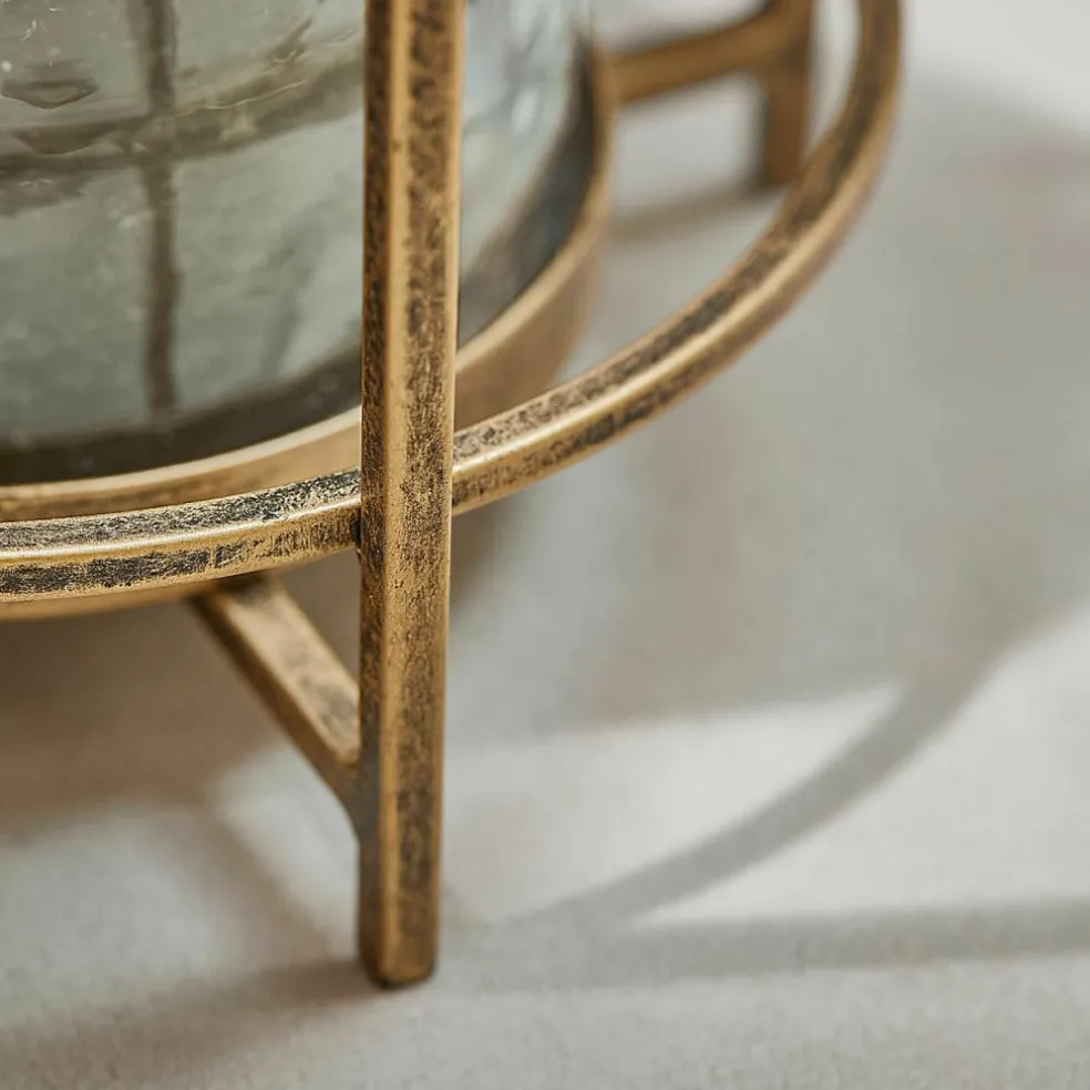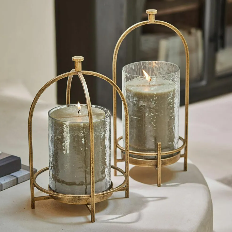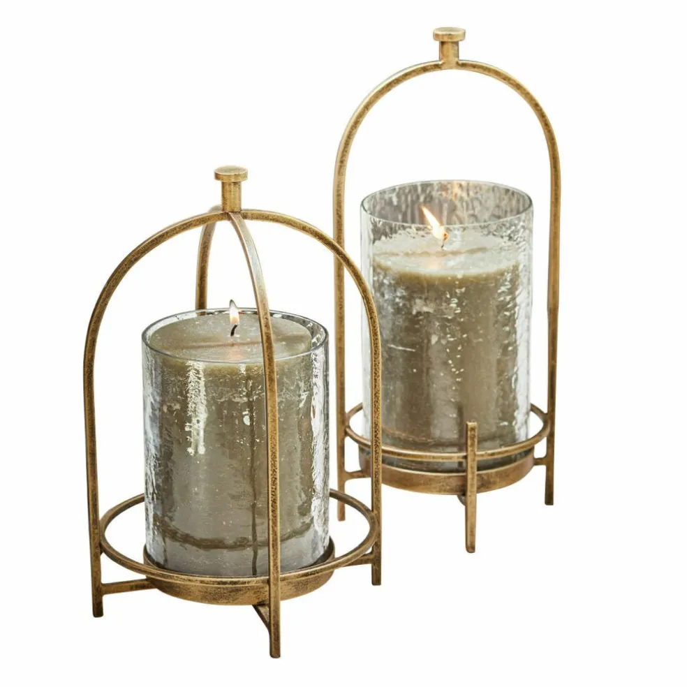 Ein Hauch von Nostalgie, verpackt in einem modernen Design – dieses Windlicht-Set begeistert mit seiner Mischung aus filigraner Metallstruktur und lebendigem Glas. Das Eisen wurde in einem warmen Antikgold-Finish veredelt, das jedem Raum einen Hauch von Vintage-Flair schenkt. Die Glaseinsätze mit ihrer gehämmerten Oberfläche erzeugen ein besonders atmosphärisches Lichtspiel und lassen sich zum Dekorieren oder Reinigen mühelos entnehmen. Die zwei verschiedenen Größen bieten kreative Möglichkeiten beim Arrangieren – ob als Duo auf dem Sideboard oder einzeln in Szene gesetzt. Ein stilvoller Lichtgeber mit Charakter.