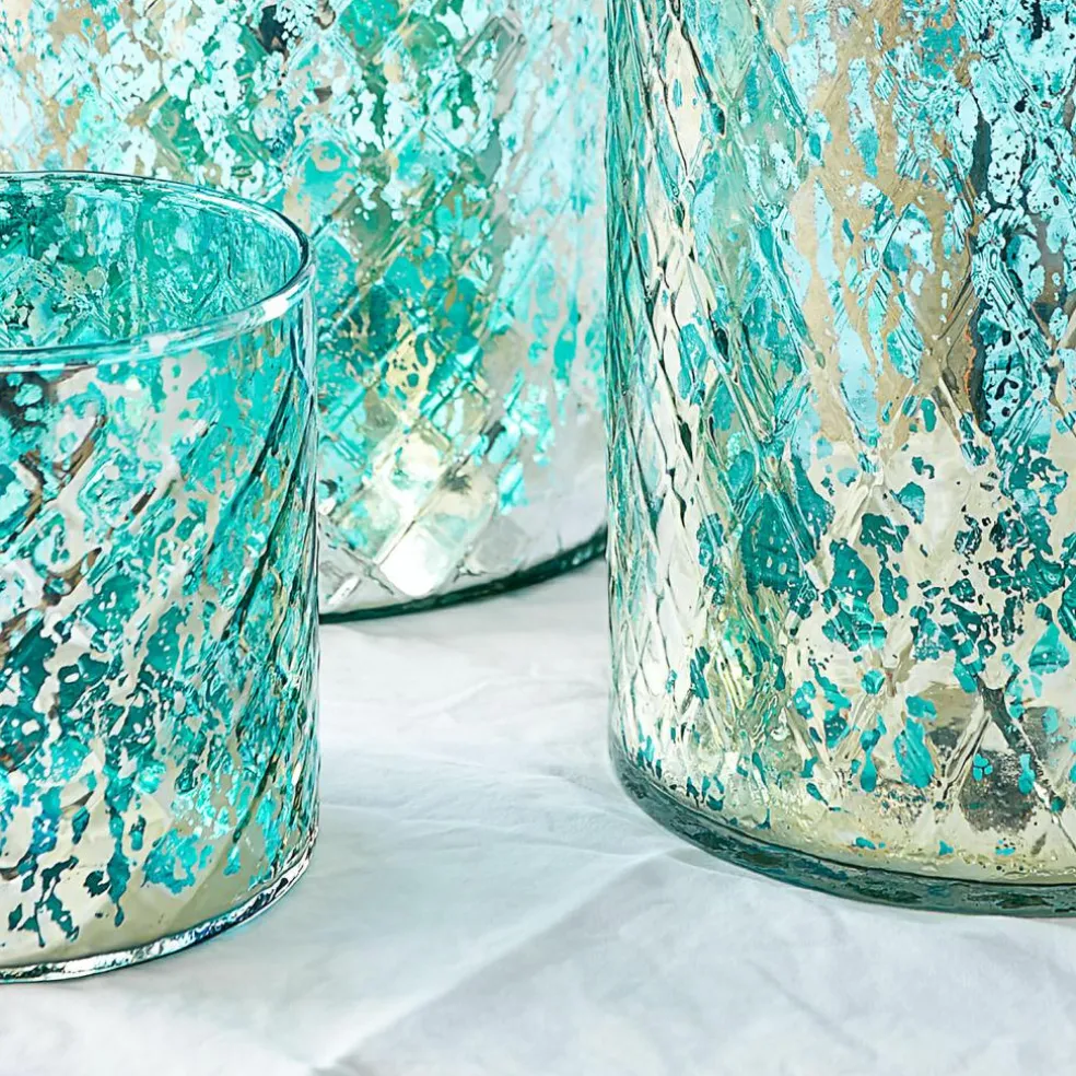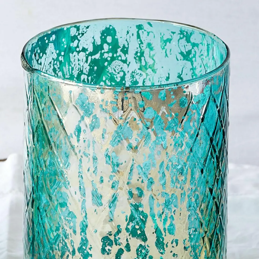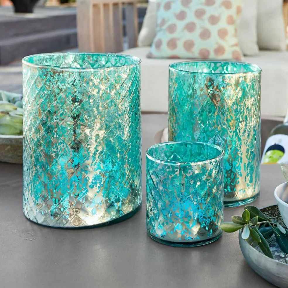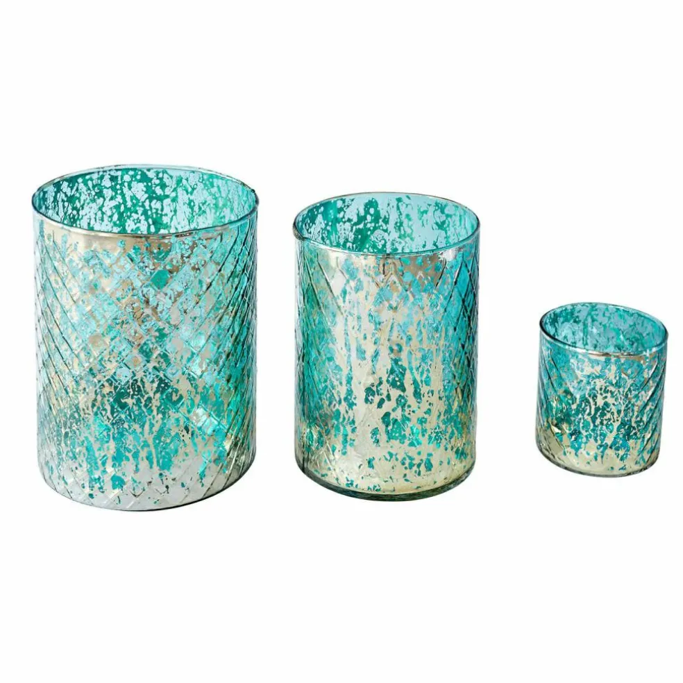 Dieses Windlicht-Set begeistert mit einer harmonischen Mischung aus Handwerkskunst und nostalgischem Flair. Jedes Glas ist mundgeblasen und zeigt ein feines Rautenmuster, das durch das edle Antiksilber-Finish eine zauberhafte Tiefe erhält. Die drei unterschiedlichen Größen eröffnen vielseitige Dekorationsmöglichkeiten – ob als stimmungsvolles Ensemble auf dem Tisch, als Akzent auf der Fensterbank oder als Highlight in Ihrer Abenddekoration. Sobald Kerzenlicht die Gläser durchdringt, entsteht ein schimmerndes Spiel aus Licht und Schatten, das jedem Raum eine warme Atmosphäre verleiht. Mit diesem Set setzen Sie geschmackvolle Akzente für jeden Anlass.