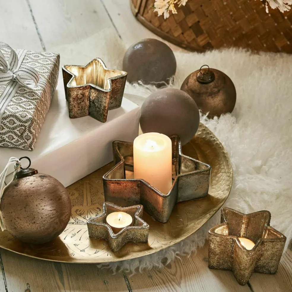 Die Sternform dieser bezaubernden Windlichter lässt jedes Herz höher schlagen und bringt einen Hauch von Magie in Ihr Zuhause. Jedes Windlicht aus dem 4er Set besteht aus hochwertigem Glas und ist mit einem antikkupfernen Finish versehen, das eine nostalgische Wärme ausstrahlt. Diese Windlichter sind nicht nur dekorativ, sondern auch funktional und bieten Platz für Teelichter, die im Inneren ein sanftes und einladendes Licht verbreiten. Ob auf dem festlich gedeckten Tisch, dem Kaminsims oder als Blickfang auf dem Fensterbrett – diese Windlichter verleihen jedem Raum eine festliche und gemütliche Stimmung.