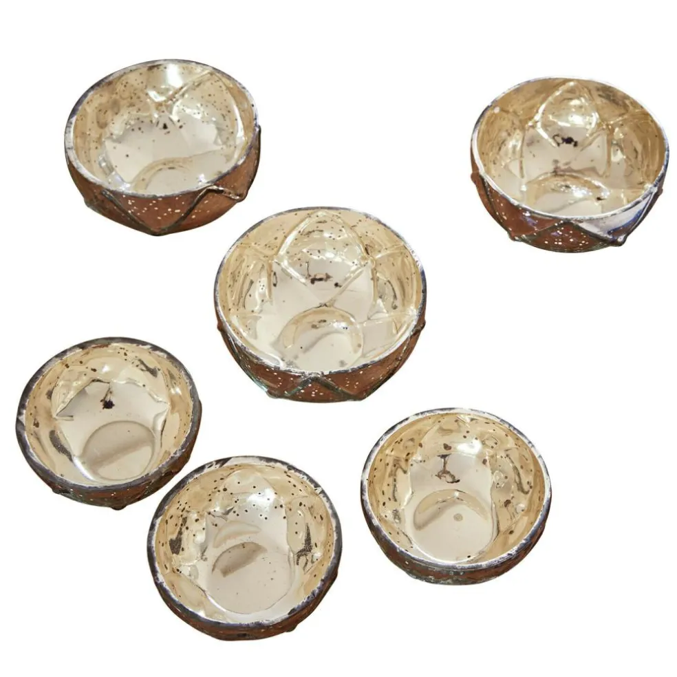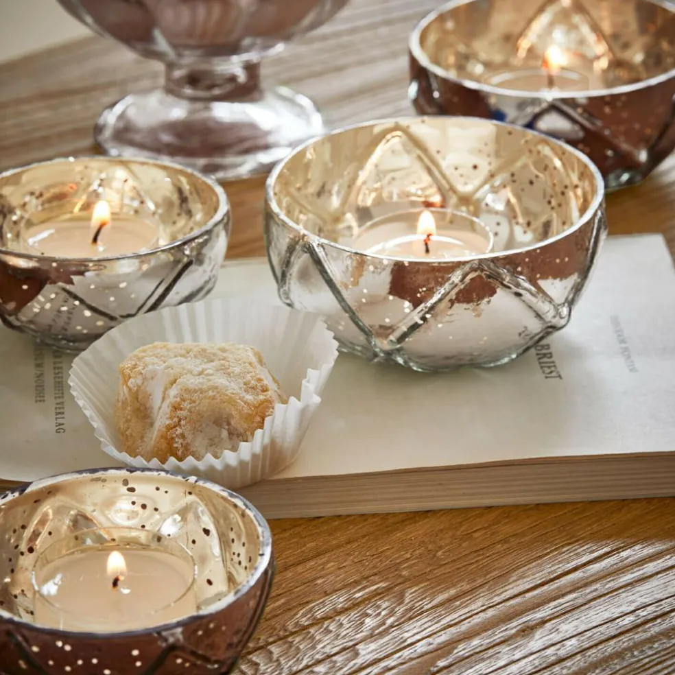 Wie kleine Edelsteine fügen sich diese sechs Windlichter in Ihre Dekoration – jedes für sich ein kleines Glanzstück. Das Bauernsilber-Finish schimmert geheimnisvoll und nostalgisch, während die eingeprägten Muster das Licht facettenreich brechen. Besonders im Kerzenschein entstehen bezaubernde Spiegelungen, die dem Raum Tiefe und Wärme verleihen. Dank ihrer kompakten Größe lassen sich die Windlichter besonders vielseitig einsetzen – auf einer festlich gedeckten Tafel, auf dem Kaminsims oder im Badezimmer für stimmungsvolle Momente. Ihre Wirkung? Still und doch eindrucksvoll.